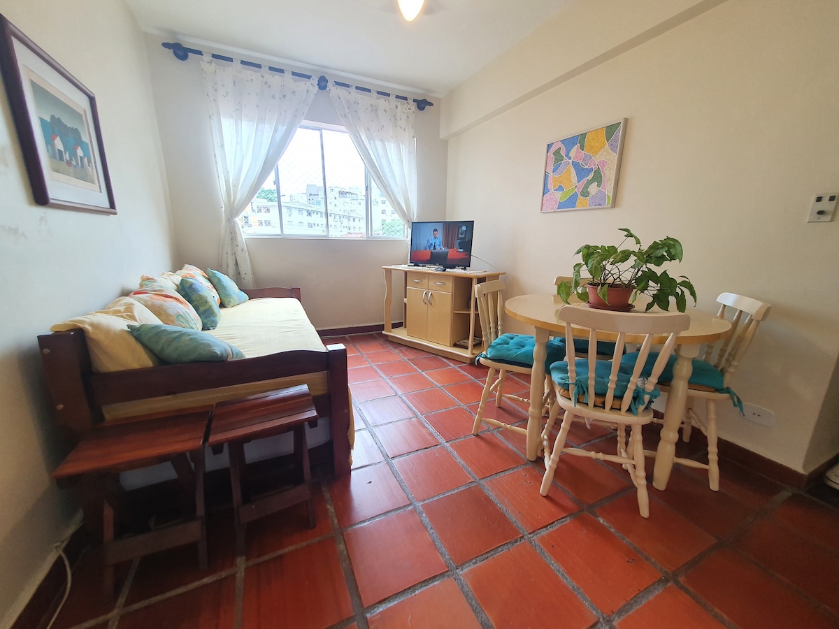 Praia do Tombo - Guarujá, São Paulo Appartement dans le quartier de Tombo, à 200 m de la plage, à 5 min en voiture de la plage de Guaíuba. 1 chambre, salon, cuisine, salle de bain, grand balcon avec vue sur la mer, climatisation (chambre), interphone, salon avec TV, canapé et ventilateur de plafond. Cuisine équipée avec réfrigérateur, micro-ondes, mixeur, sandwicherie, cuisinière et accessoires, 1 place de parking. Nous ne fournissons pas de linge de lit et de serviettes !