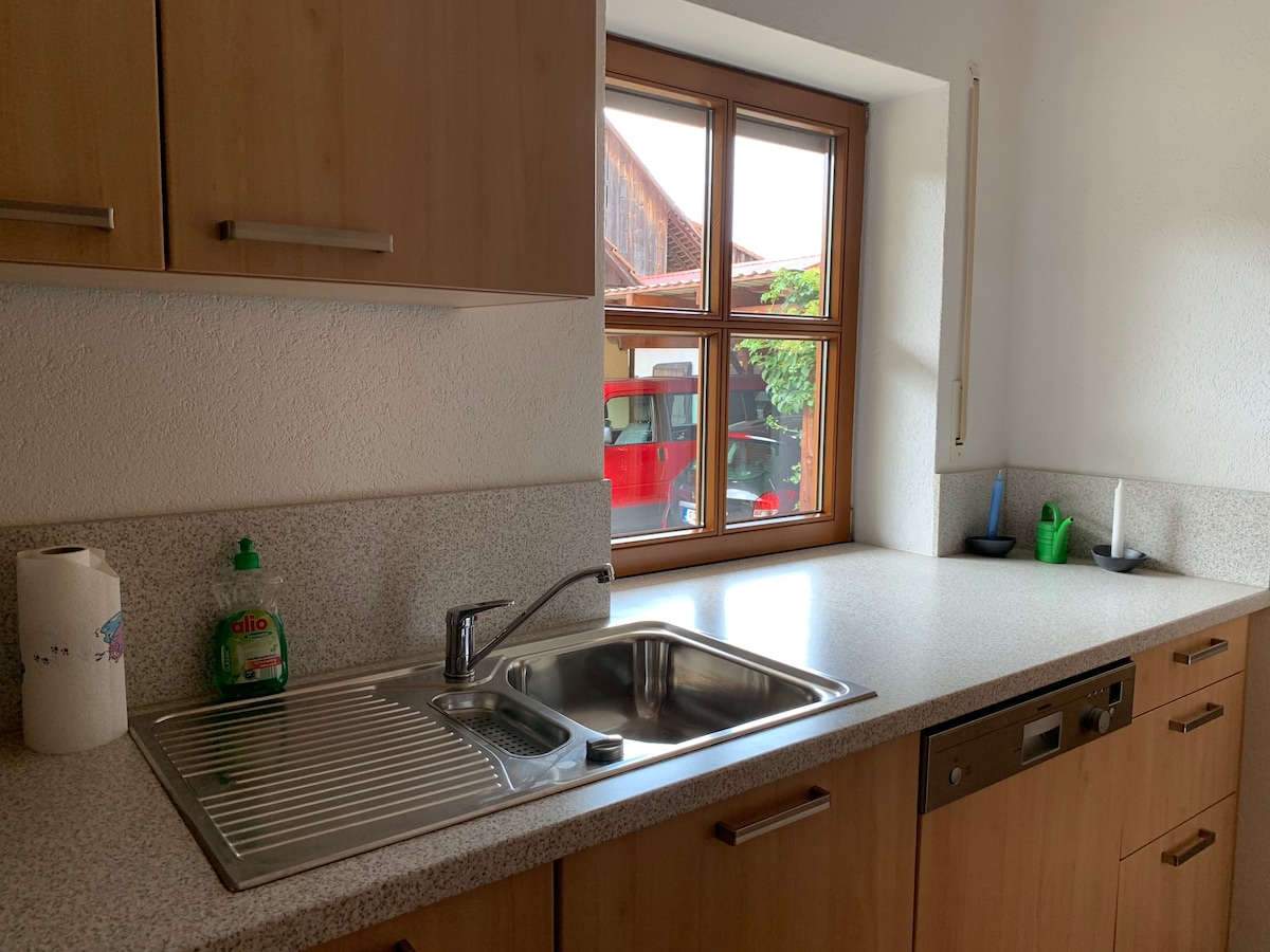 Kleine, offen gestaltete Ferienwohnung/ Einliegerwohnung im Erdgeschoß mit Einbauküche (Kaffeemaschine, Toaster, Wasserkocher, Kühlschrank mit Gefrierfach), Bad (Shampoo, Duschgel etc.) mit Dusche und WC, Handtücher, Bettwäsche, Föhn. Schlafzimmer mit Kleiderschrank, Wohnzimmer mit Schlafsofa, Esstisch, TV. Sagt uns gerne Bescheid wenn wir die Schlafcouch beziehen sollen. Familie mit Kinder sind herzlich willkommen, es ist ein Hochstuhl vorhanden sowie verschiedene Spielsachen.