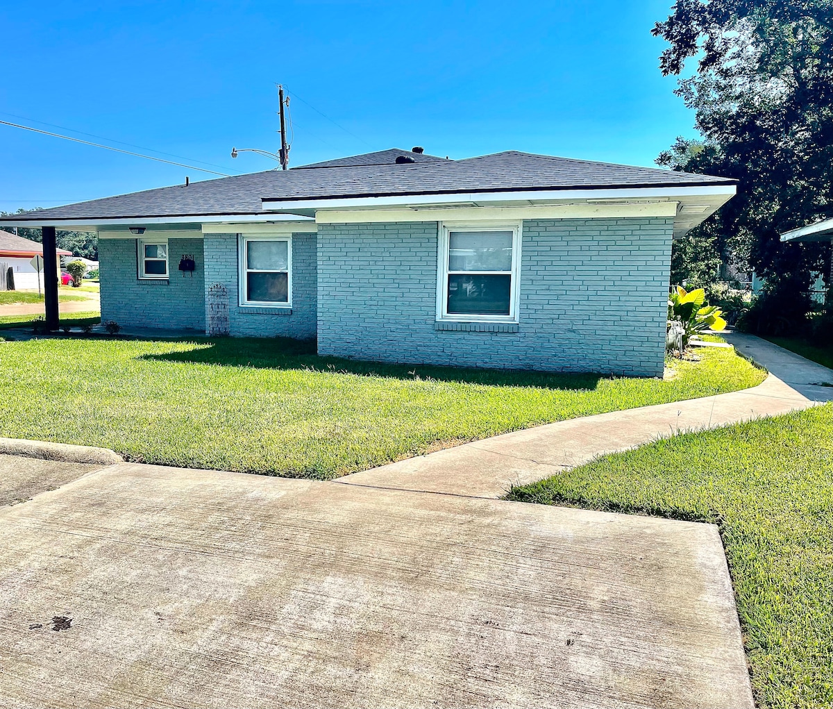 Grande maison de 2 chambres et 2 salles de bain (186 m²). Près des casinos et des restaurants. La troisième chambre et la salle de bain sont dans la maison d'hôtes extérieure (37 m²). Route sans issue. Zone sûre. Quartier calme et agréable. À distance de marche du parc et du kayak. Garage pour 2 voitures avec allée de 55'. Cour arrière privée clôturée avec patio et barbecue. Maison bien équipée pour votre voyage à Lake Charles. Pas de fête ni de soirée autorisée !