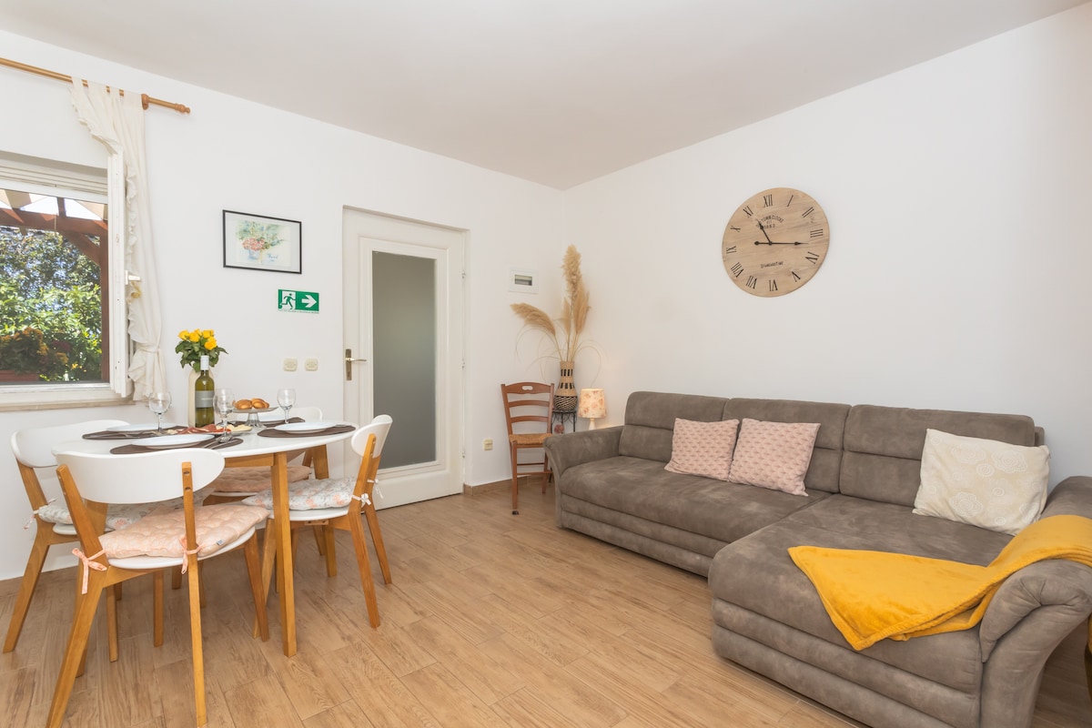 Apartment Mia is 3 km from Np Krka, Lozovac, and offers a quiet stay for 2 adults or 2 adults and 2 children only. It includes a bedroom, living room with sofa bed, kitchen, bathroom, terrace, free Wi-Fi, free parking, and shared pool (open 1.6.–30.9.). Ideal for families and nature lovers. A car is necessary. Shops and restaurant (Golub) are nearby only 1 km from us. We recommend visiting Šibenik, Skradin, and Solaris Aqua Park during your stay. Also explore beautiful beaches in the area.