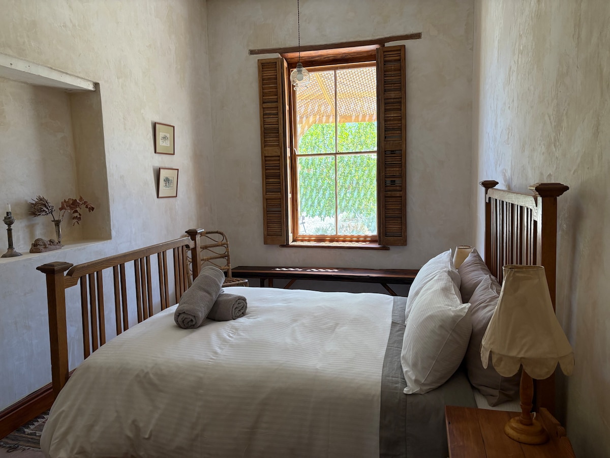 The Karoo-style Cottage Suite sleeps two and is tucked away in the pretty gardens behind the main house at Casa Milorca, which was built in 1860 and is situated in one of Prince Albert's prettiest streets in the historic heart of the town. The cottage has a king-size bed with quality white bed linen, and there is an en suite bathroom with shower, as well as a compact lounge and dining area. The kitchenette area has washing up facilities, a toaster, kettle, microwave and bar fridge, and basic kitchen utensils. There is also a tea and coffee station with home-baked rusks. The Cottage Suite, which has its own private verandah, can also be configured with two single beds instead of a king-size bed. Thanks to air-conditioning the cottage is cool in summer and warm in winter; there is also has a standing fan if that is preferred.