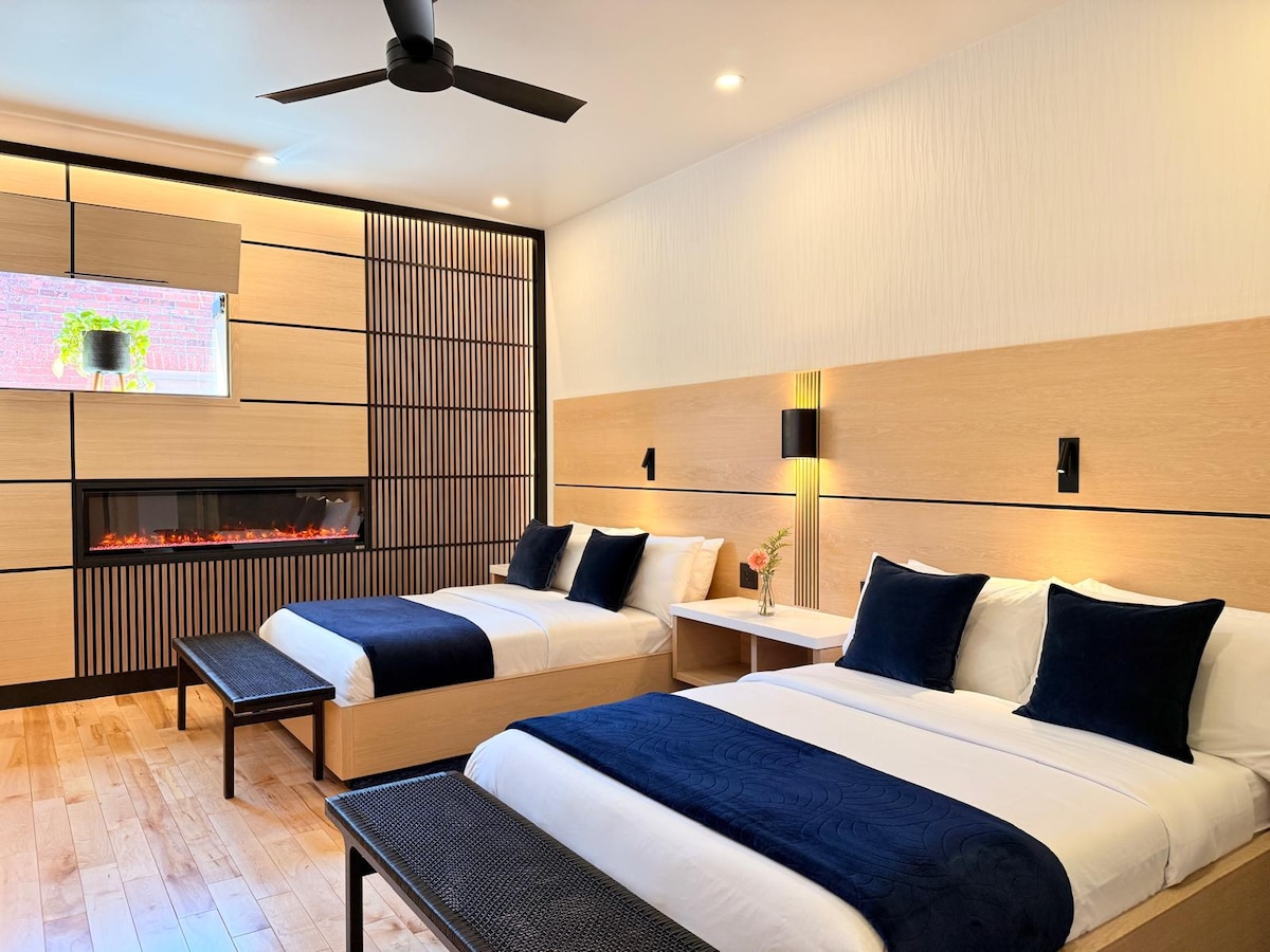 Cette suite de 447 pieds carrés dispose de deux lits queen pour les voyageurs de groupe ou ceux qui veulent juste leur propre espace. La suite 5 dispose d'une douche à l'italienne avec une grande fenêtre donnant sur la chambre (store d'intimité), permettant un maximum de lumière à travers, d'un water-closet séparé, d'un chauffage par le sol radiant, d'une cheminée ambiante, d'un poste de travail, d'une télévision connectée 75", d'une station de maquillage et d'un minibar. L'espace salle de bain dispose d'une chambre qui divise le rideau pour plus d'intimité de l'espace de couchage.