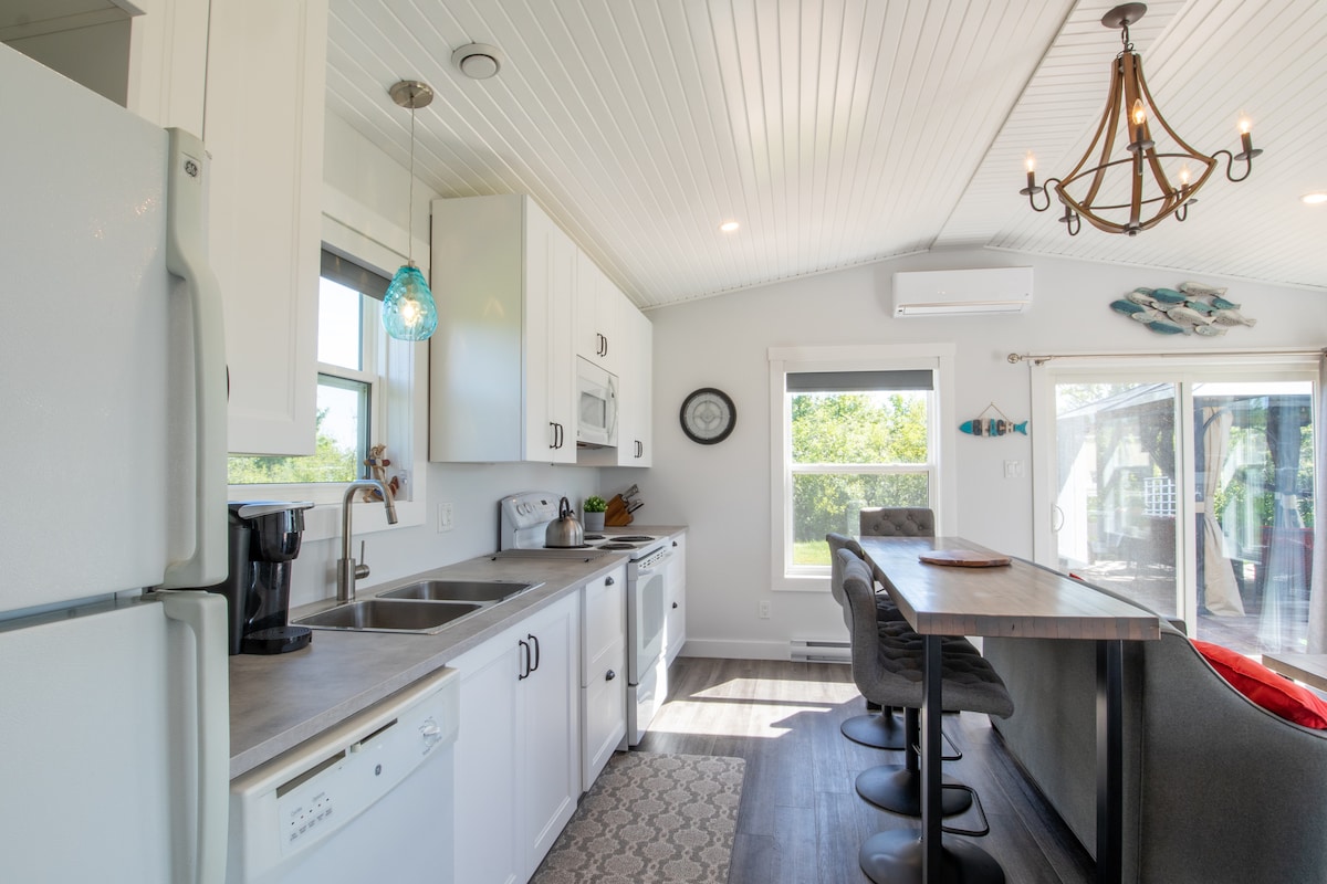Chalet confortable et lumineux avec ambiance de plage situé dans une rue calme en cul de sac à 5 min à pied sur une promenade d'une belle plage de 5 km Aboiteau, pavillon bleu ! Le chalet peut accueillir 4 personnes. Comprend un foyer électrique avec sortie pour faire le tour de la terrasse et du belvédère. Lit double et canapé convertible. WiFi, Internet haut débit, télévision, climatisation, table de style pub sur mesure, cuisine entièrement équipée, barbecue au propane, grande douche à l'italienne, espace séparé avec lave-linge et sèche-linge. Jeu de fléchettes. Mobilier d'intérieur et d'extérieur confortable.