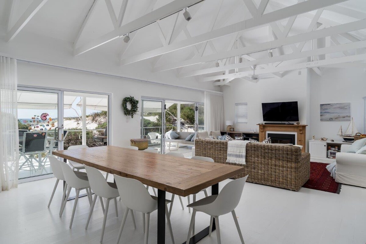 Maison parfaite pour se reconnecter entre amis ou en famille, avec une piscine pour l'été et des cheminées pour l'hiver. Les dunes de sable sont à 15 mètres de la maison, et la plage à 3 minutes à pied Idéal pour 1 ou 2 familles avec jusqu'à 6 enfants, ou 3 couples. Remarque : ne convient pas pour plus de 6 adultes. La maison est aménagée avec une cuisine bien équipée, un braai intérieur et extérieur, des jeux de société/pelouse et une télévision avec Netflix.