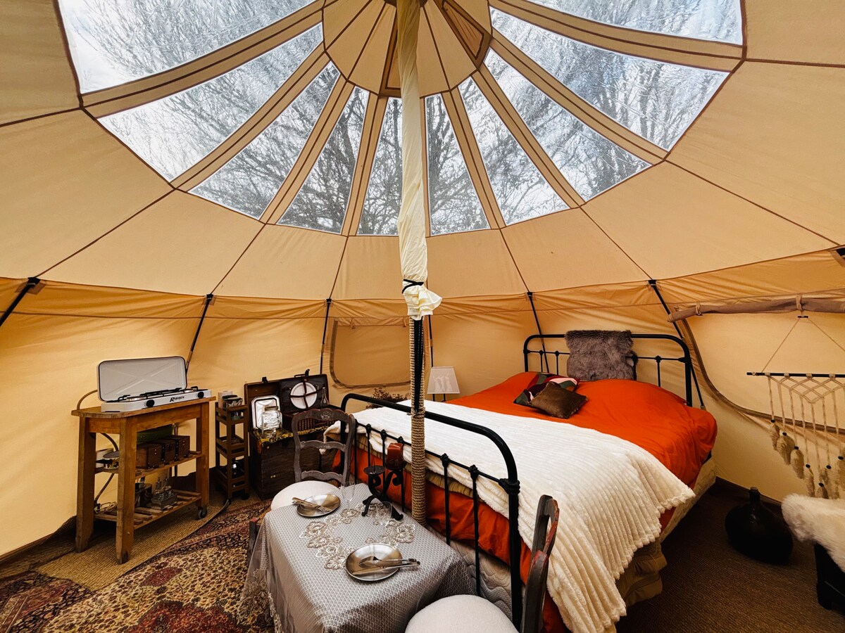 Séjour atypique en pleine nature. Calme et sérénité assurés. Vous disposerez d'une tente autonome, équipée pour votre confort, intégrée dans la forêt. (A proximité et entièrement dédiés, douche, toilettes sèches, évier. A l'intérieur: poêle, réchaud, petite vaisselle). Nombreux sentiers de randonnées au départ de la tente. Stationnement à l'entrée de la forêt à moins de 5 minutes à pieds ou au pied de la tente pour les plus téméraires (accès par un sentier carrossable). Expérience inoubliable.