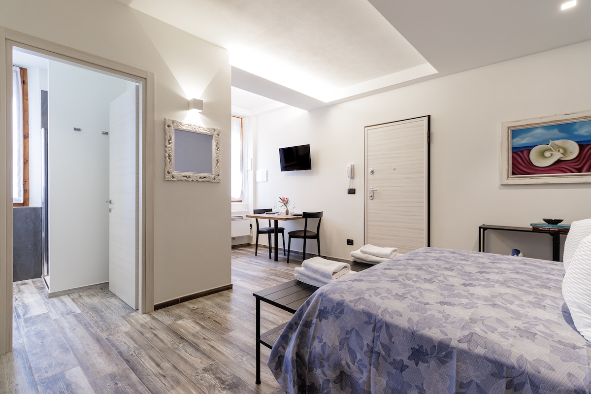 Joli appartement de deux pièces, spacieux et lumineux avec poutres apparentes. Situé à quelques pas du château d’Este, de la cathédrale, de la maison Romei et du palais Schifanoia. Au deuxième étage sans ascenseur avec une toute nouvelle cuisine équipée. La porte coulissante mène au coin nuit. Climatisation, SkyTV et Wi-Fi Salle de bain avec fenêtre. Petit déjeuner et nettoyage quotidien de la chambre inclus Idéal pour passer vos journées dans la belle ville de Ferrare.