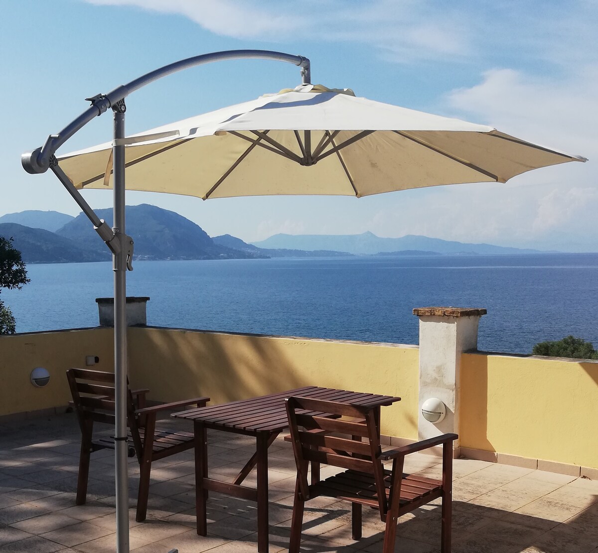 Notre villa est située à proximité du village balnéaire de Mesonghi dans la partie sud de l'île. Le rez-de-chaussée dispose de deux chambres, d'un salon, de deux salles de bains et d'une cuisine entièrement équipée qui comprend tout ce dont vous avez besoin pour un séjour confortable et agréable. La maison dispose d'une très belle vue panoramique sur la baie de Mesonghi ainsi que sur le paysage vert environnant avec des oliviers et des cyprès. Elle dispose également d'une connexion Wi-Fi gratuite, de la climatisation, de Netflix et d'une piscine ronde de 4,5 mètres dans le jardin de la maison.