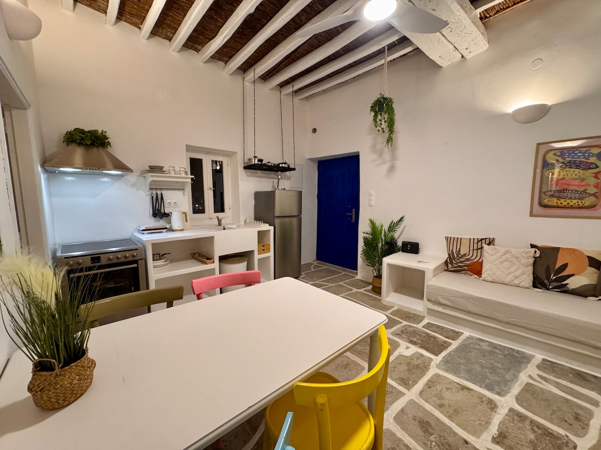 Situé au cœur de la pittoresque Chora d'Ios, ce véritable appartement cycladique est charmant, coloré et intime, situé dans l'un des quartiers les plus pittoresques et reposants de Chora, où vous pourrez profiter d'une vue imprenable sur le village (Chora) et la mer Égée ! Le mélange de design d'intérieur traditionnel et contemporain crée l'élégance et le luxe, avec une touche de gaieté dans la sélection des couleurs, dans le choix des objets et des textures.