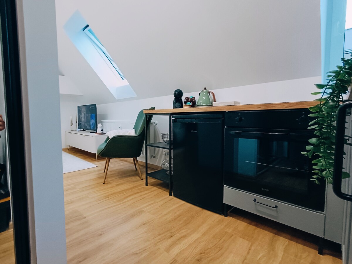 Studio shelter house d'une superficie de 33 m² avec balcon dans une lucarne, avec une belle vue sur les Tatras occidentaux. Intérieur spacieux de 4 mètres avec finition en bois de mélèze. Lit « king size » 180 x 200 cm avec possibilité de séparation en 2 lits simples. Kitchenette avec lave-vaisselle, réfrigérateur, micro-ondes, grille-pain et cafetière. Le canapé-lit de 100 cm de large rend le studio confortable pour 2 personnes ou 2 personnes avec un enfant. Baignoire dans un espace ouvert, toilettes avec lavabo dans une pièce séparée.