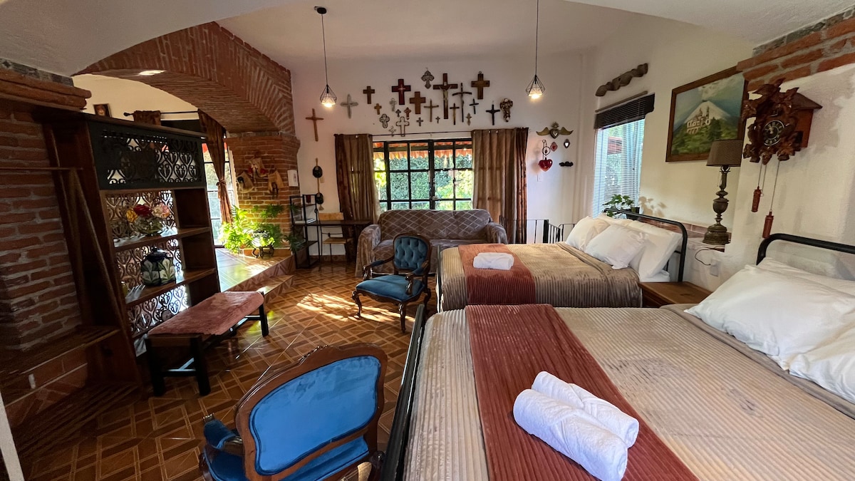 Profitez d'un confort moderne dans un manoir du XVIIe siècle. Le loft comprend une chambre, une kitchenette, une salle à manger et une terrasse avec vue sur les volcans et la Grande Pyramide. Les voyageurs ont accès à la bibliothèque et au patio central du manoir avec entrée indépendante. Situé à 3 pâtés de maisons du Zocalo et à 10 minutes à pied de la Grande Pyramide. Parking gratuit et services de spa en option. Adultes seulement. Facturation disponible.