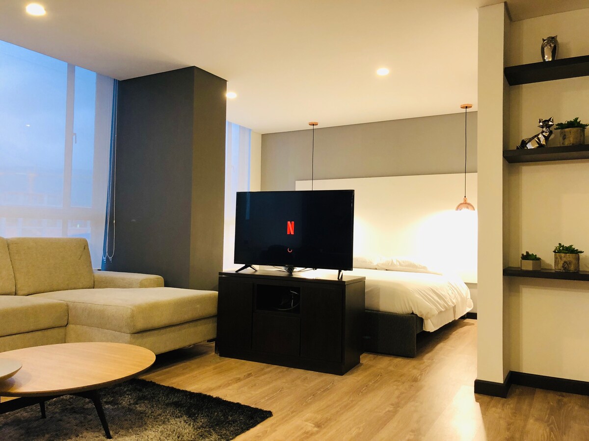 Appartement studio moderne à Chía avec coworking, salle de sport, barbecue et espaces de travail extérieurs. Entièrement meublé : cuisine équipée, lit double, salle à manger, coin studio, télévision avec Netflix, Wi-Fi et internet. À proximité de Centro Chía, Centromayor, Fontanar et l'Université de La Sabana. Idéal pour le travail ou le repos. Réservez maintenant !