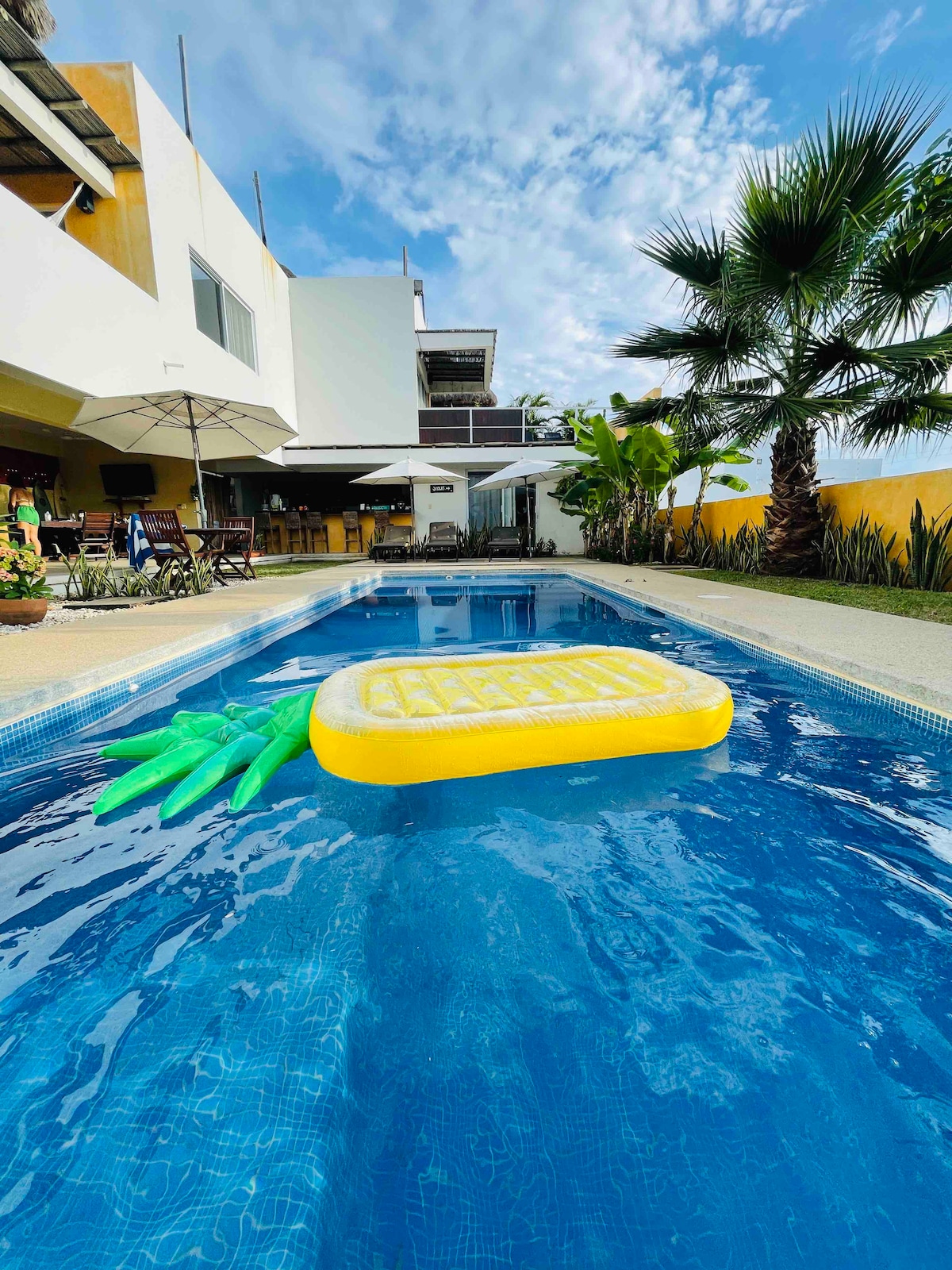 CASA TSUKI, totalmente privada, a 5 minutos de la playa, vista al mar. -WIFI de alta velocidad -4 recamaras con baño completo y aire acondicionado de última generación -5 camas, 2 sofás, la principal con sala grande integrada en el mismo espacio con balcón y gran terraza con otra sala. -Comedor, cocina y gran sala en planta baja -Alberca única en su diseño y tamaño -Palapa en espectacular terraza con sala y cocineta -Garaje para 2 autos -Bodega, sistema de seguridad y Smart TV.