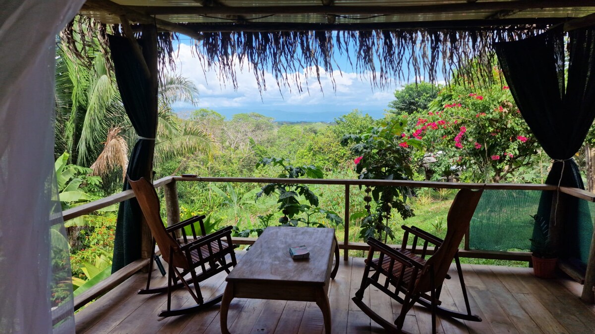 Détendez-vous en pleine nature dans toutes les directions. Notre cabane rustique offre une vue magnifique sur les montagnes et le golfe, qui vous laissera plus calme dès que vous vous asseyez. Nous sommes situés à seulement 10 minutes de la ville et à 10 minutes de la plage, isolés dans les montagnes paisibles avec la nature de tous les côtés. Nous sommes un BnB complet à l'ancienne avec petit déjeuner Tico traditionnel inclus (et autres repas disponibles à l'achat). Nos deux cabanes partagent une cuisine extérieure entièrement équipée.