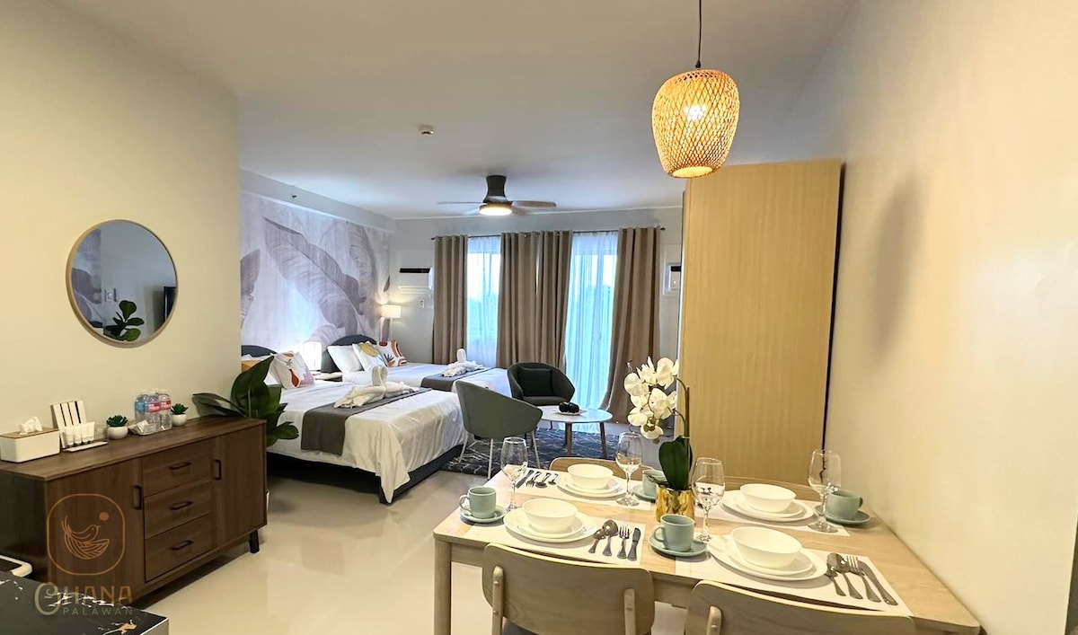 Appartement élégant, entièrement meublé et abordable avec balcon. Un retour loin de chez vous. Idéal pour les couples ou une compagnie de 2 personnes. Paisible et bien situé, à proximité des commodités, de l'aéroport et des lieux touristiques. Accès gratuit à la piscine, au club-house et à la salle de sport. Un « Tagnabua moderne » a inspiré le design de la propriété en tant que reconnaissance de la culture indigène de l'île de Palawan. WIFI disponible avec télévision, toilette et douche attenantes, kitchenette complète avec ustensiles et ensemble de salle à manger. Séjours courts et longs.