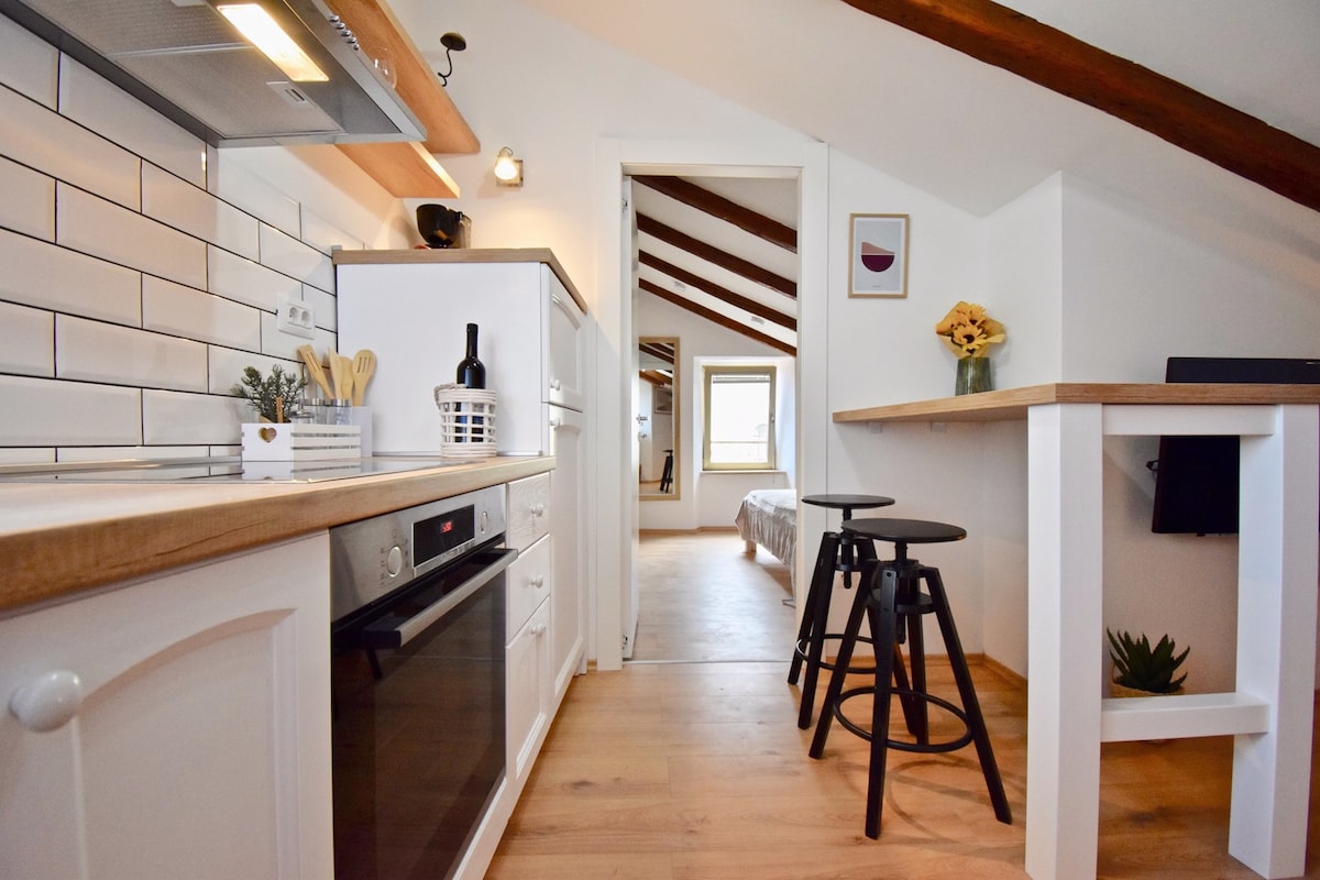 L'appartement dispose de deux étages, d'une superficie de 54 m2. Au rez-de-chaussée, il y a un salon avec la cuisine dans le même grand espace, une salle de bains et un charmant balcon. En haut des escaliers, vous trouverez une chambre romantique avec un petit coin salon. Nous acceptons les animaux de compagnie et acceptons un animal de compagnie gratuitement, mais nous facturerons des frais de 5 € par jour pour chaque animal de compagnie supplémentaire au-delà du premier.