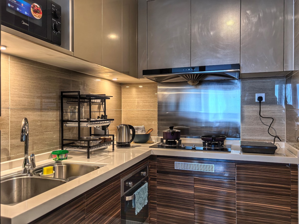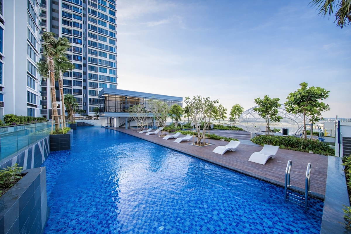Il s'agit d'un logement spacieux de 2 chambres parfaitement adapté pour les voyageurs jusqu'à 5 personnes avec un total de 1 lit king size, 1 lit queen size et 1 lit simple. Étage élevé avec vue dégagée. 1. Terrain de basket-ball 1. Salle de sport 2. Salle polyvalente 3. Salon 4. Bibliothèque 5. Boutique de manucure 6. Mini-théâtre 7. Terrasse pour barbecue 8. Piscine 9. Sauna 10. Jacuzzi 11. Salle de jeux (billard, salle de jeux vidéo, fléchettes et plus encore) 12. Buanderie 13. Supérette - Jardin suspendu Les voyageurs ne sont pas autorisés à fumer dans la chambre, veuillez fumer sur le balcon si nécessaire.