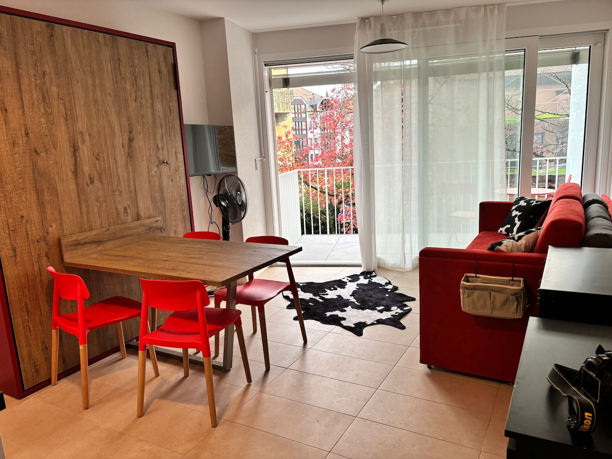 Bienvenue dans ce charmant studio suisse, conçu pour permettre à un maximum de quatre voyageurs de profiter d'un séjour confortable et efficace. Idéalement situé à seulement quelques pas de l'arrêt de bus et à proximité des commodités locales, cet appartement trouve l'équilibre parfait entre praticité et confort. À l'intérieur, vous découvrirez un aménagement moderne et maximisant l'espace. Le lit double Murphy se replie facilement pour ouvrir la chambre, et le canapé fait également office de lit superposé, offrant un espace de couchage supplémentaire en cas de besoin.