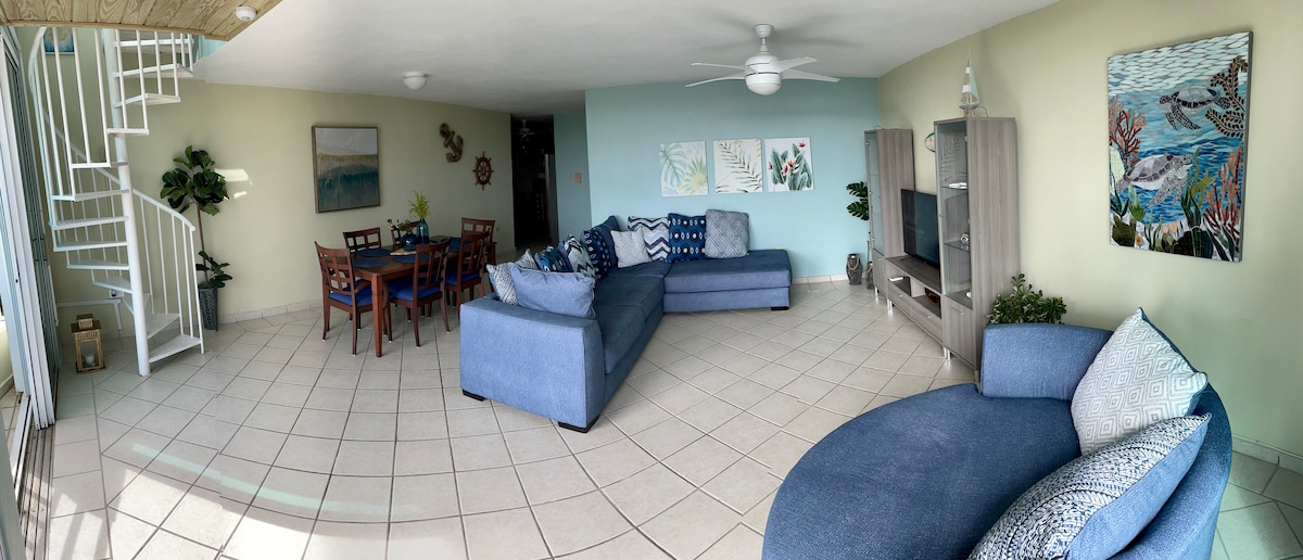 Appartement penthouse entièrement décoré (deux étages), situé dans un complexe en bord de mer : Punta Bandera, une communauté accessible à pied dans la ville tranquille de Luquillo, à Porto Rico. Les installations comprennent une entrée fermée avec gardien de sécurité, un parking, un bel aménagement paysager et des espaces communs bien entretenus, un belvédère et une porte de plage qui vous amène directement au paradis. Équipé de tout ce dont vous aurez besoin pour passer un bon moment, apportez simplement votre maillot de bain et profitez-en !