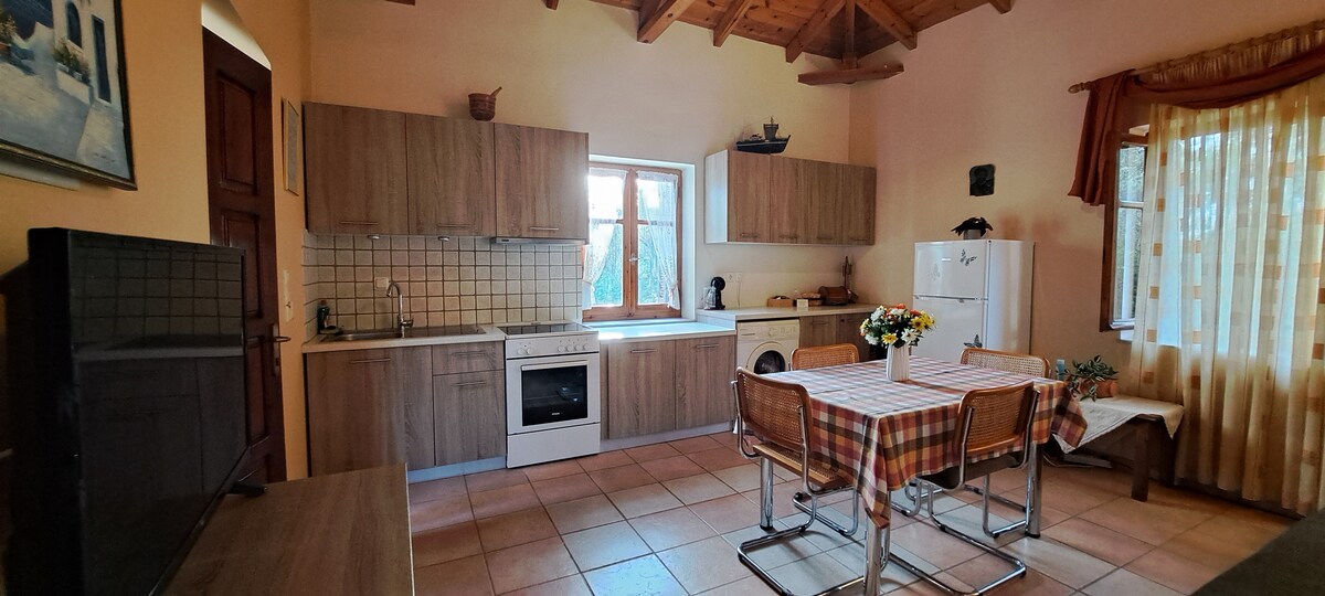 La maison est située au sommet de la mer, avec une vue unique sur la baie de Messinienne et des couchers de soleil inoubliables. Cela vous donne l'impression d'être à bord d'un navire. Vous pourrez profiter du grand jardin ainsi que du reste de l'espace, qui est conçu pour offrir confort et détente pendant vos vacances. La mer se trouve à distance de marche de la maison (3 min).