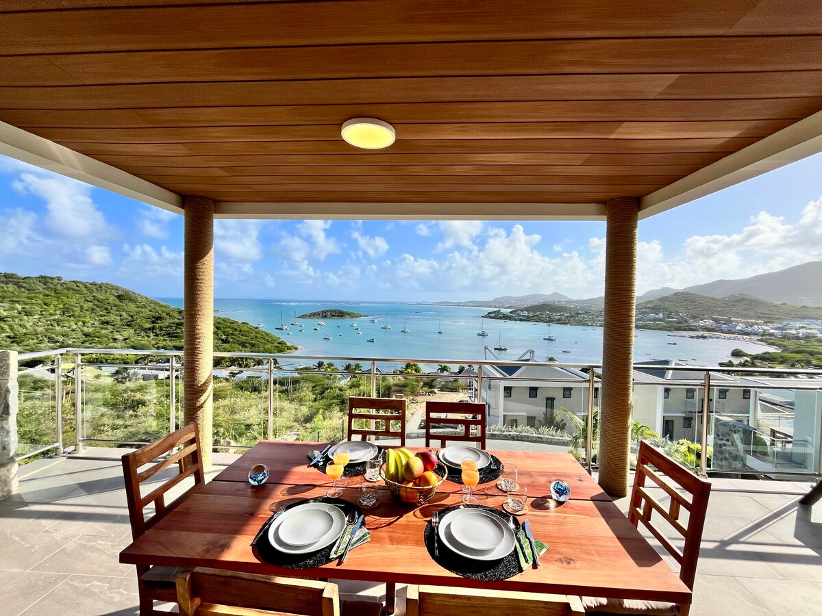 C'est la plus belle vue de toute la Baie Orientale! Vue spectaculaire sur toute la plage de la BO, Saint-Barth, l’île de Tintamarre et une partie de l’îlet Pinel. Une expérience unique. L’appartement entièrement refait à neuf : 2 chambres séparées (sans cloison mitoyenne = intimité parfaite pour deux couples), lits king size, 2 Sdb, 2 WC. Mezzanine avec couchage simple (90×200). Cuisine entièrement équipée Triple exposition = ventilation naturelle Accès direct à la plage de la Baie Orientale