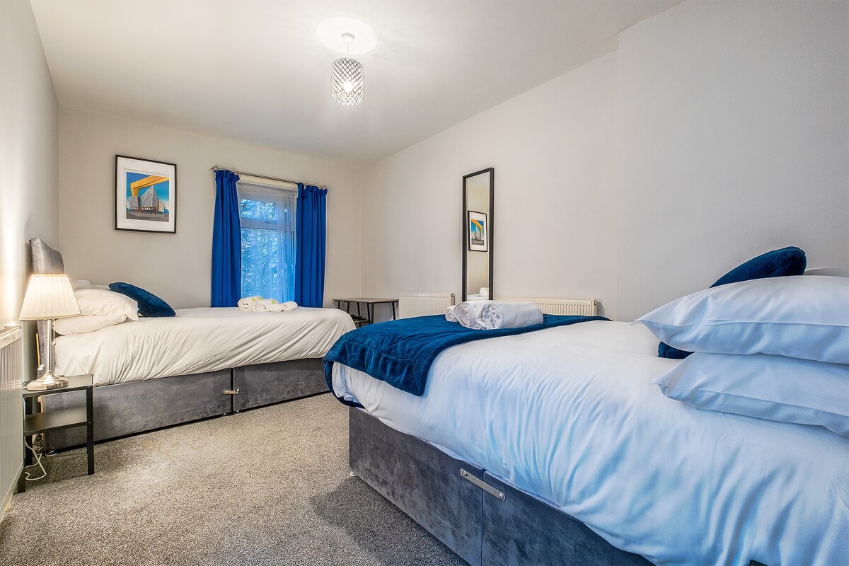 Appartement au rez-de-chaussée, une chambre et bureau, dans un emplacement en centre-ville, parking juste à la porte d'entrée. Parfait pour une escapade citadine luxueuse ou une visite de travail. La chambre dispose d'un lit King size et le bureau est équipé d'une connexion haut débit et d'une station d'accueil. L'appartement est situé dans une rue calme avec un supermarché Tesco, un distributeur automatique de billets et une pharmacie à quelques minutes à pied. Le centre-ville, la gare centrale et l'université Queens se trouvent tous à moins de 10 minutes à pied.