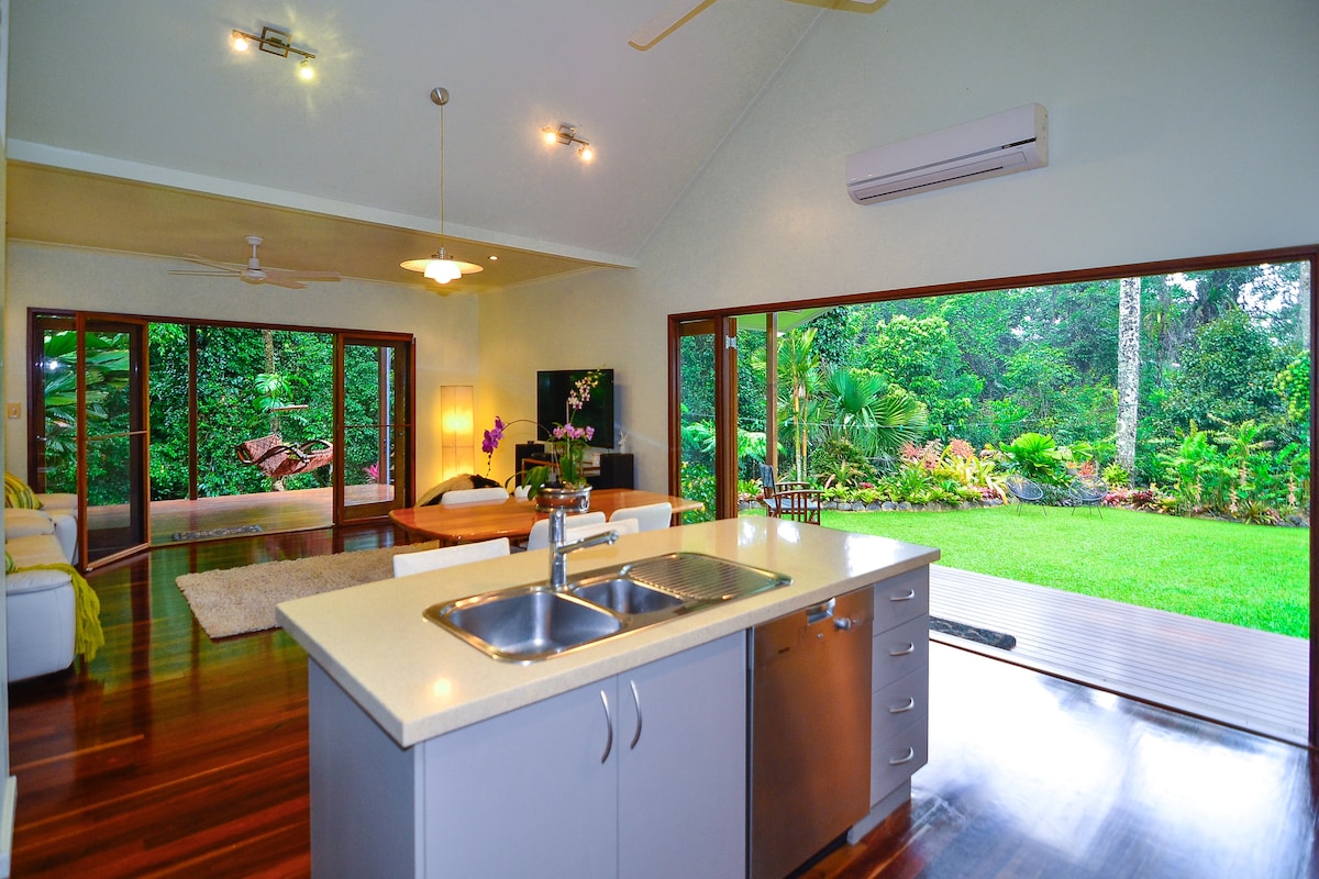 À propos de ce logement À côté du célèbre Misty Mountains Rainforest Retreat, présenté dans la série Netflix Instant Hotel. Luxueuse maison de deux chambres (plus une troisième chambre mansardée) dans une forêt tropicale entièrement privée, donnant sur un ruisseau cristallin à 45 minutes au sud de Cairns. Vos propres trous de baignade privés. À proximité des chutes Josephine, des Boulders et des îles Frankland.