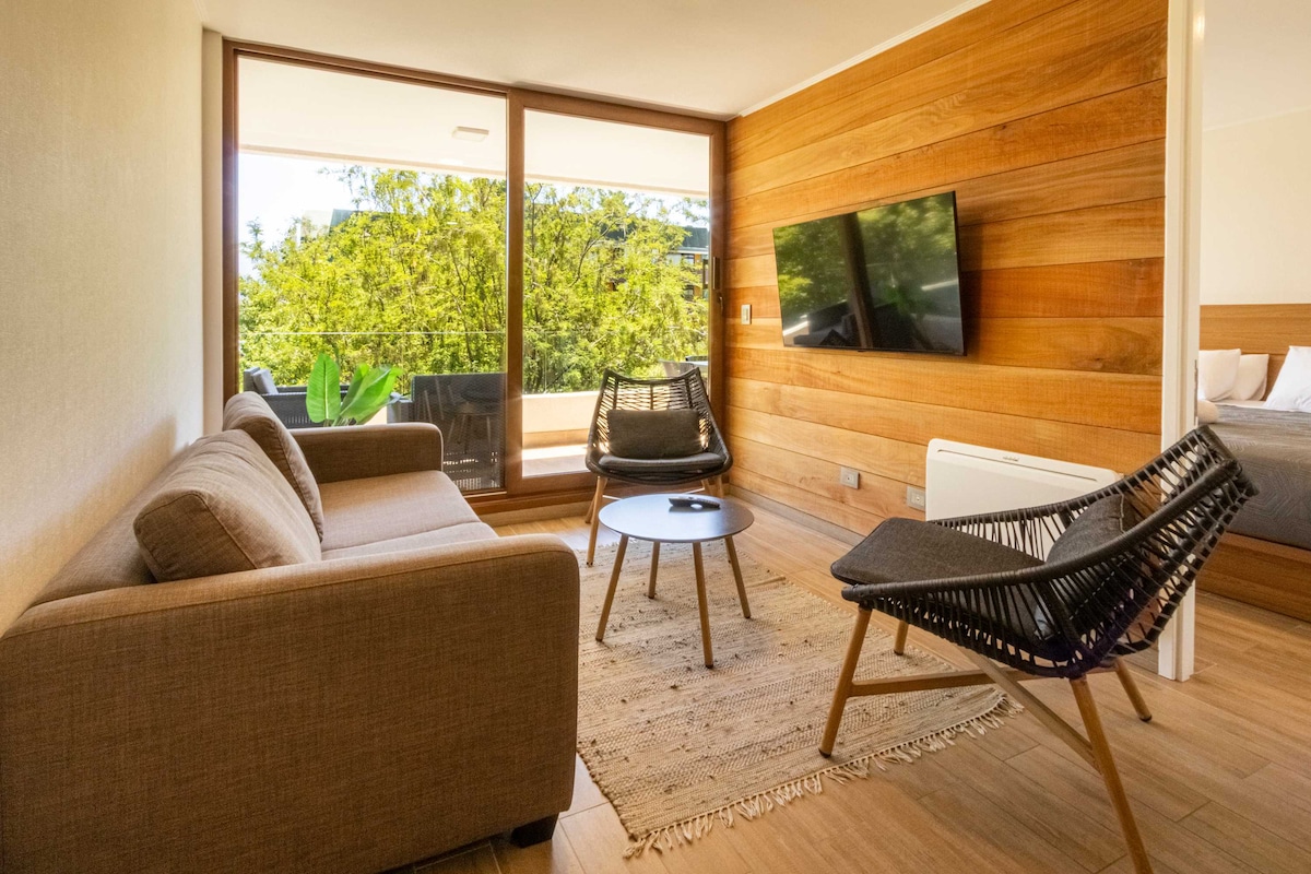 Studio neuf et confortable dans le meilleur emplacement de Pucón, à quelques pas de la grande plage, du centre, et isolé du bruit de la rue principale. Il dispose d'un lit 2 places, d'un futon 2 places, d'une cuisine entièrement équipée, d'une salle de bains complète, du WiFi, d'une télévision 49" avec Netflix, Disney+ et plus encore, d'une terrasse, du chauffage, d'un barbecue, de cafetières, de 2 vélos à usage illimité, entre autres. Parking public disponible devant l'accès au bâtiment. Comprend le linge de lit, les serviettes et les fournitures de base de salle de bain et de cuisine pour chaque séjour.