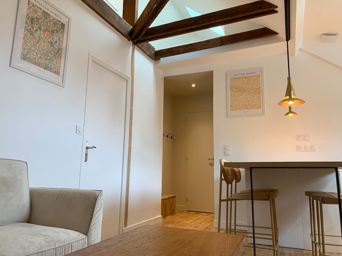 Pour votre séjour à Quimper, en vacances ou déplacement professionnel, nous vous proposons un appartement de 45 m2 ayant une situation exceptionnelle. Dans un quartier vivant mêlant commerces (restaurants, bar et supérette), cet appartement est situé dans un immeuble sécurisé (avec digicode) au 3ème étage sans ascenseur. Cet appartement indépendant de style nordique mansardé vous accueille par un bel escalier qui vous amène dans un séjour lumineux et spacieux.