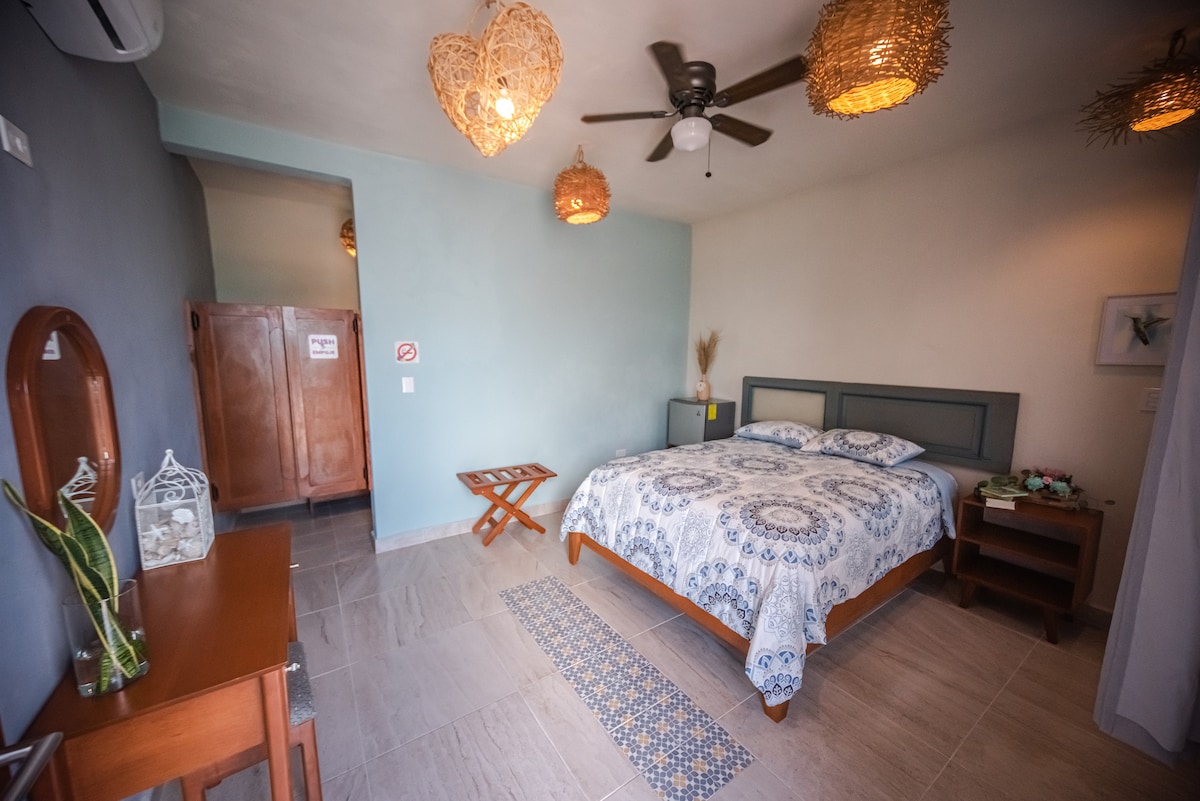Cette belle cabane en bois est un endroit idéal pour trouver l'harmonie entre le corps et l'esprit dans un cadre exotique de luxe. Équipé d'AC et kitcheneta avec micro-ondes, cafetière, mixeur et réfrigérateur. Salle de bain privée avec eau chaude et serviettes. Beaucoup d'espace extérieur avec des hamacs et Palapa pour profiter des beaux jardins et de la piscine en commun. Nous sommes situés à seulement 3 pâtés de maisons des restaurants et des activités touristiques, dans le meilleur quartier résidentiel, et à seulement 2 pâtés de maisons de la mer.