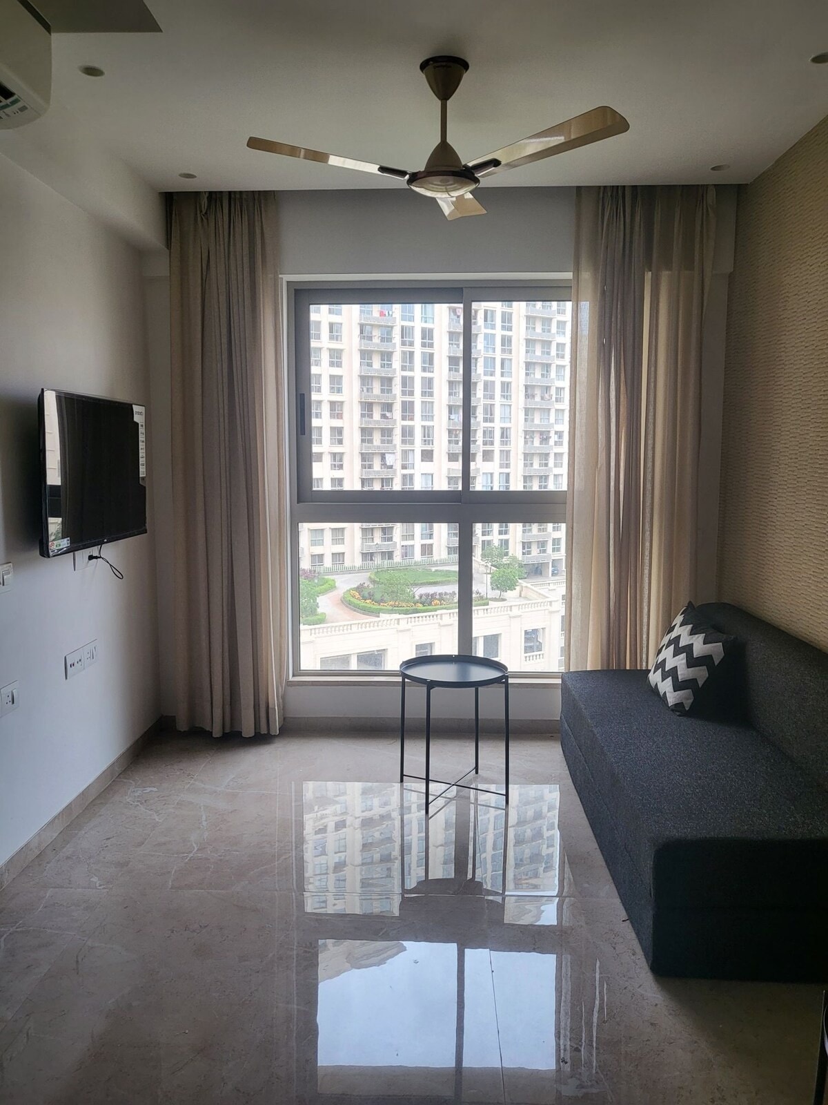Very spacious 2bhk flat with beautiful view from both the bedrooms. 5mins walking distance to Rcity mall, close to station, restaurants, Powai, Godrej, Hiranandani hospital. It is located on 11th floor, the building is of 30 floors with gym on rooftop. You can use the facilities like gym and swimming at extra cost. The property is located right Infront of Poptates Vikroli west. Building name is Mayfair the views. It’s a newly constructed building.
