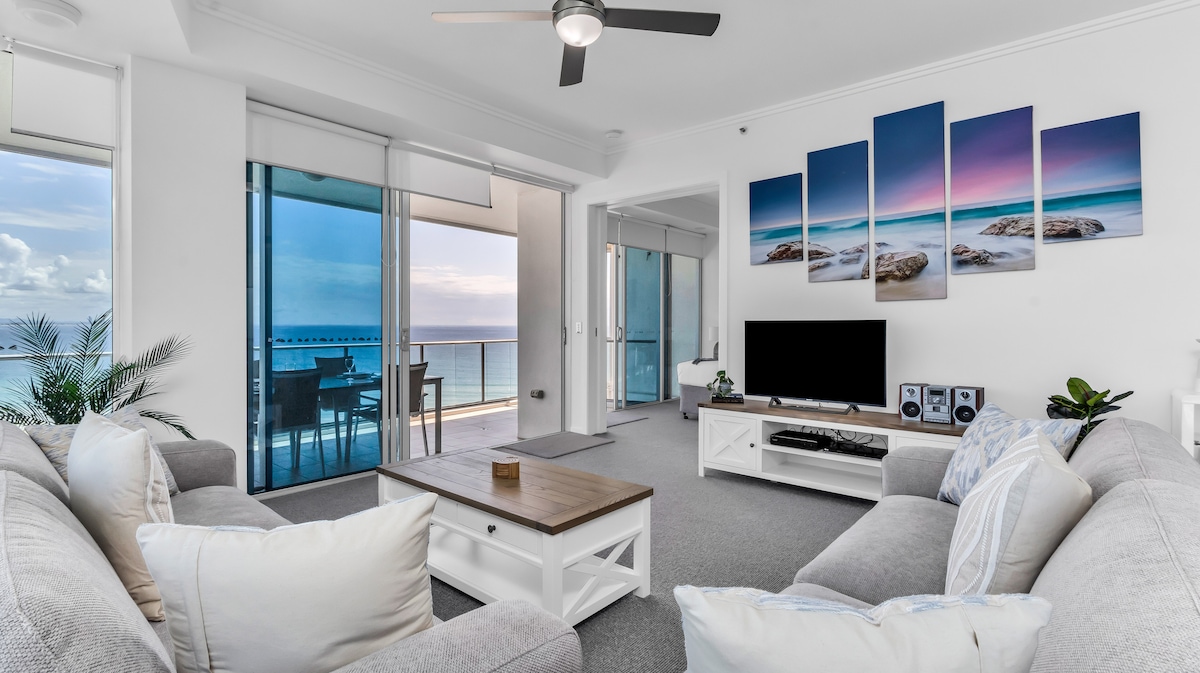 💝 Pourquoi vous allez l'adorer Emplacement privilégié sur l'📍Esplanade – À quelques pas de la plage, de Cavill Avenue, des commerces et de la vie nocturne des surfeurs Vue 🌅 imprenable sur l'océan – Admirez le lever du soleil sur la mer depuis votre balcon privé au 67e étage 🛏️ 2 chambres avec confort de style hôtelier – Comprend une suite parentale avec dressing et salle de bain attenante | Climatisation partout Balcon vitré🌿 privé : sirotez votre café du matin au-dessus de la ligne d'horizon ou détendez-vous au coucher du soleil 🏊 Installations de villégiature 5 étoiles : salle de sport, sauna et terrasse extérieure (niveau 33)