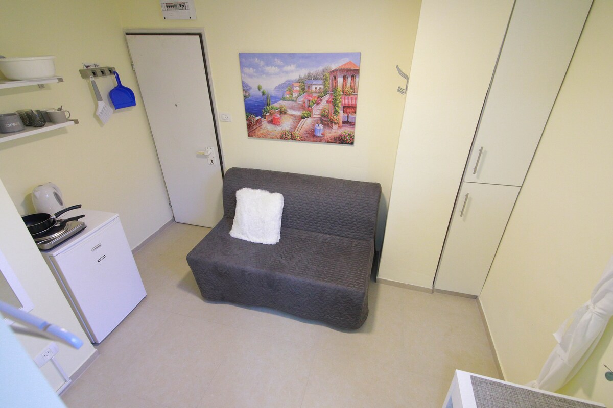 This small (about 10sqm) furnished studio in Arnona is located on the basement floor (a few steps under the building entrance). It includes 1 bathroom with a shower, a sofabed, radiator for heat in the winter or fan in the summer, refrigerator, 1 electric burner (hot plate), and a desk. Sleeps 1 or 2. Situated next to a synagogue, children's playground, and near a mini market and public transportation. Close to Baka and Talpiot and walking distance to the Old City!