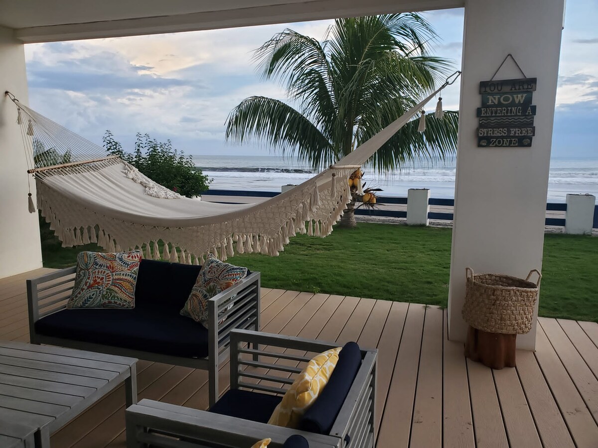 Maison de deux chambres en bord de mer à Popoyo, directement sur la plage. Lumineux et aéré, il dispose de chambres confortables, d'une cuisine entièrement équipée, d'un espace de vie ouvert avec une vue imprenable sur l'océan et d'une piscine commune. Vous séjournerez au 2e étage. Détendez-vous sur le balcon face à l'océan ou surfez sur des vagues de classe mondiale à quelques minutes seulement. Emplacement paisible, mais à proximité des restaurants et des bars de plage de Popoyo, parfait pour les couples, les familles ou les amis à la recherche d'une escapade détendue. Climatisation dans chacune des chambres, Internet rapide.