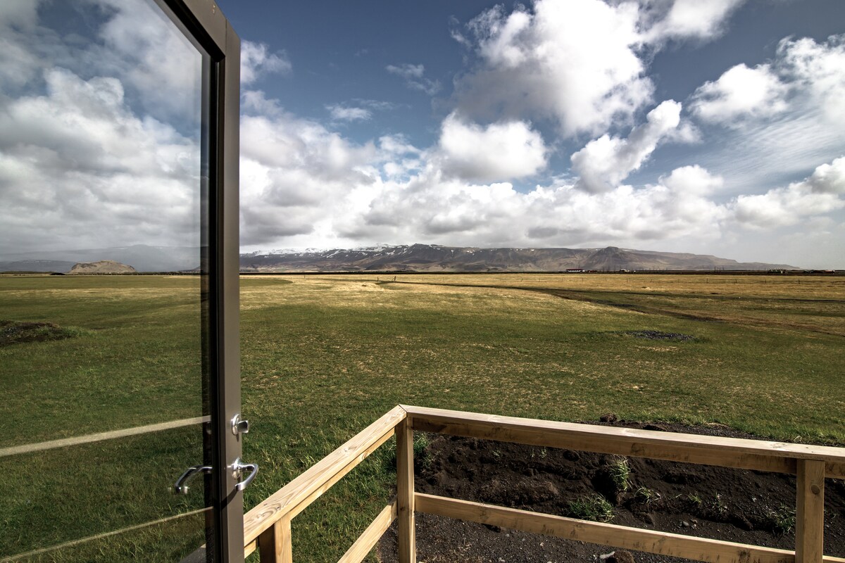 Escape to your private nature retreat! Cosy Cabin where you can soak in the jacuzzi under the Northern Lights, surrounded by breath-taking landscape and enjoy water massage. Your haven includes a fully equipped kitchen, high-speed WIFI, and total privacy at Icelandic farm with grazing sheep and friendly horses. Prime location: 15 min to Skógafoss & Seljalandsfoss waterfalls 20 min to Vestmannaeyjar ferry_Puffins 30 min to Vík and black beach Easy access to glaciers, hot springs and adventure!