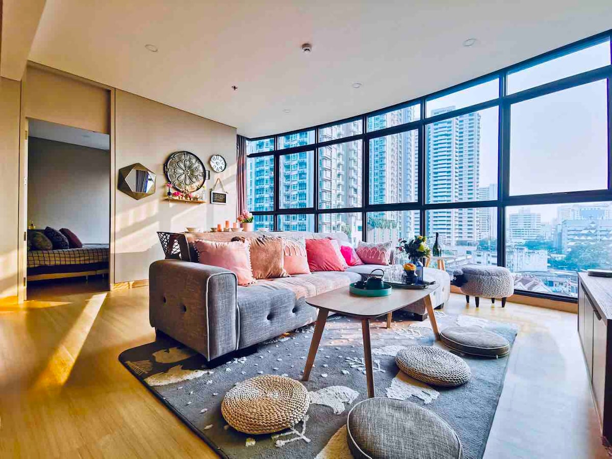 Un appartement entier spacieux avec salle de bain privée, kitchenette, séjour/salle à manger, 1 chambre avec espace de travail désigné et balcon. Profitez des larges fenêtres pour une vue imprenable et beaucoup de lumière du soleil, augmentant l'aération pour un séjour plus relaxant. Profitez de toutes les commodités de la vie urbaine, notamment : - À 5 min de BTS Asok, MRT Sukhumvit - à 5 min de Terminal 21, Emporium/Emquartier et du parc Benjasiri - À 1 min du magasin 7-11 - Beaucoup de cuisine de rue, café et taxis/vélos
