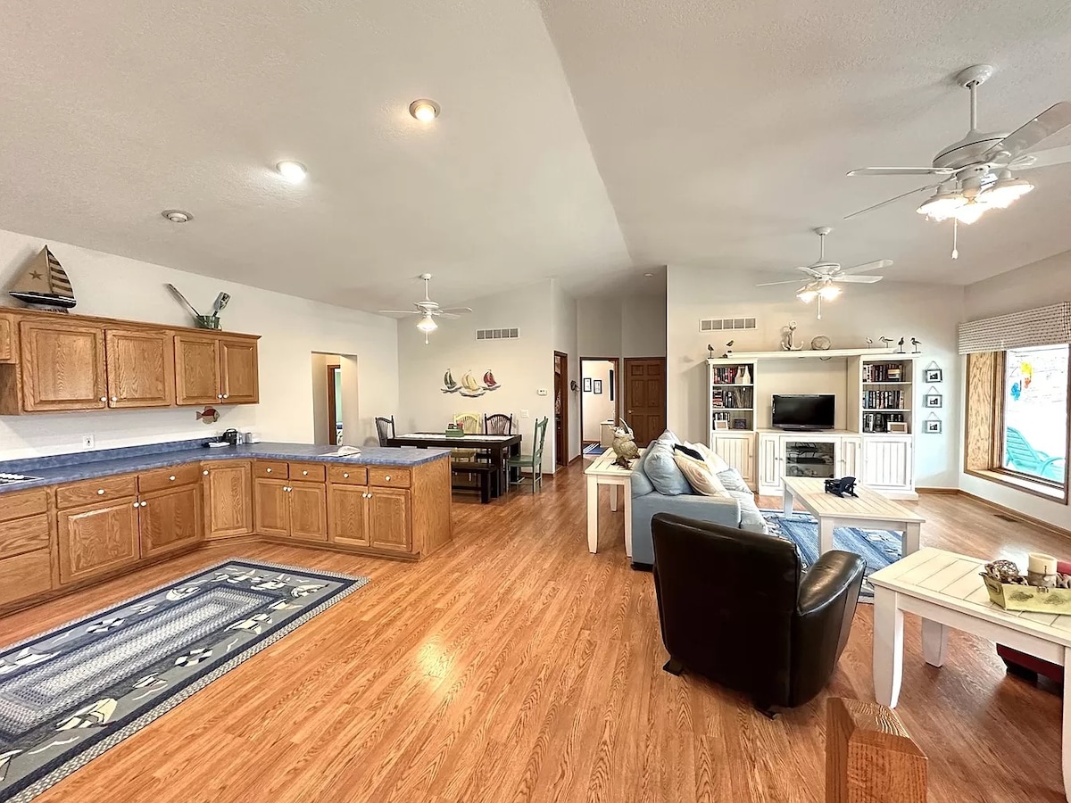 This house is a true lake getaway that has its own private trail right to the Lake Rathbun beach! As you enter the house you'll enjoy the open layout of the living room, kitchen, and dining space with access to a great deck to sit and relax. Off the main area you will discover 4 bedrooms and 2 bathrooms. You will also have access to the large garage below with plenty of room to park a boat.