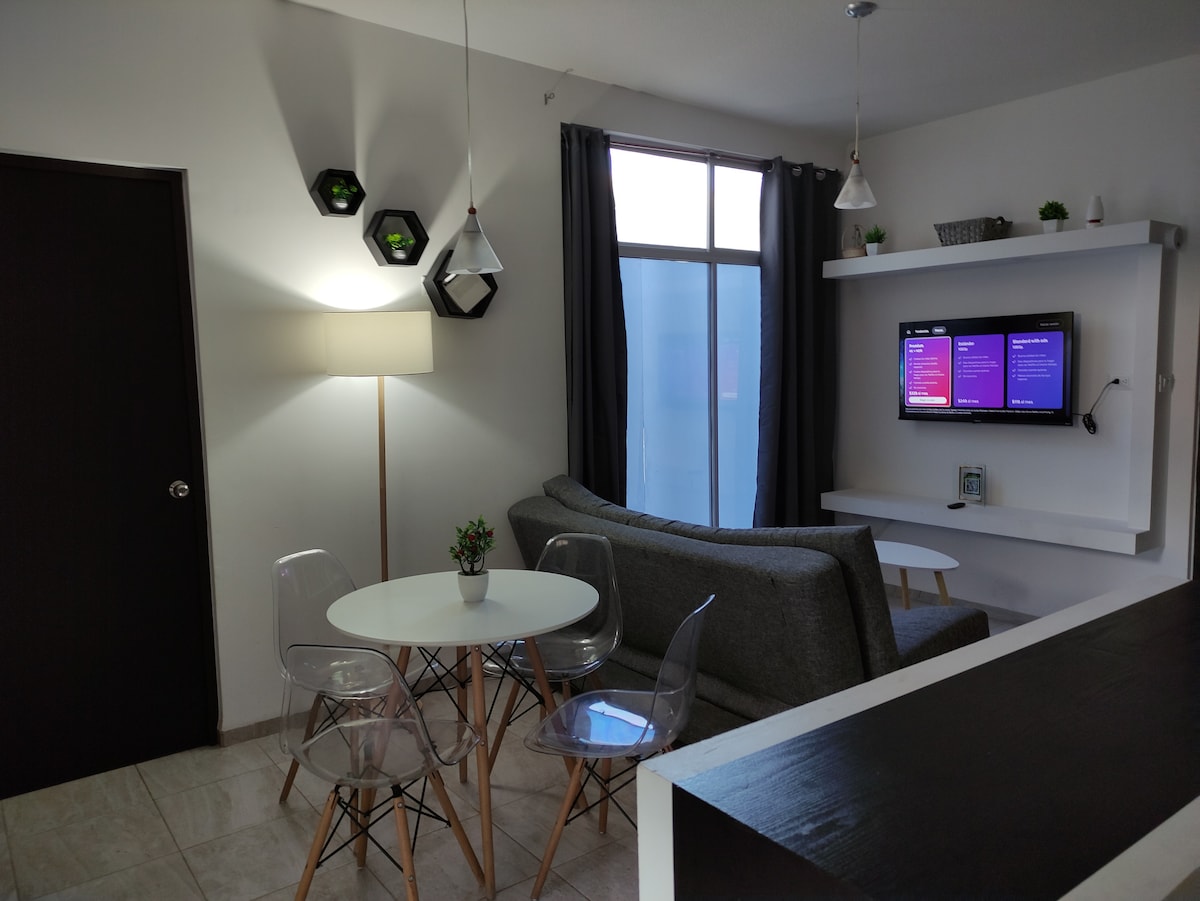 Profite du confort de cet appartement calme, confortable et central. Il est situé à quelques pas de la route de Matehuala sur une avenue principale avec un accès rapide. À proximité, vous trouverez : des pharmacies, des centres commerciaux, des stations-service, des restaurants, des stands de nourriture et en face un Oxxo. À 10 minutes, vous arriverez au centre historique, à 7 minutes du terminal terrestre et à 15 minutes de l'aéroport international de San Luis Potosí.