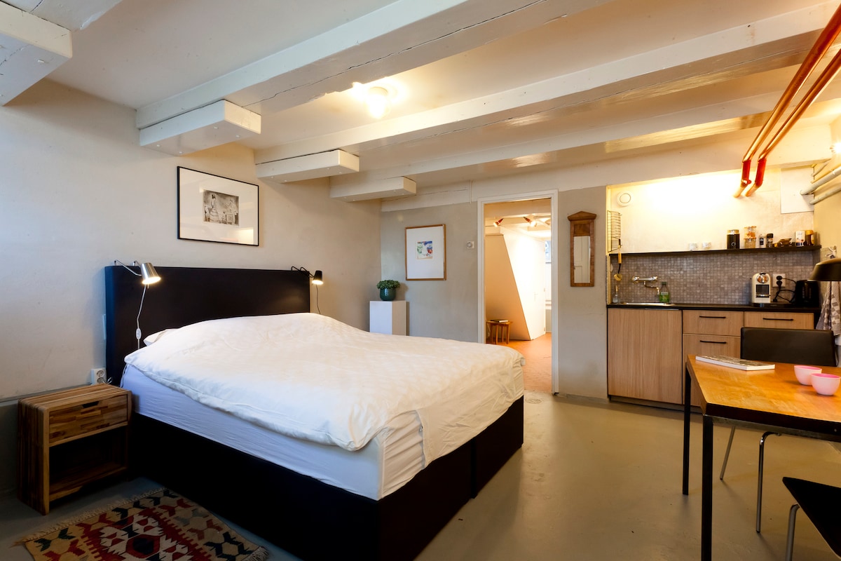 Free parking on site! BBinAmsterdam. Studio en-suite. Vintage and industrial design vibe in sustainable architectural house. Also private entrance and hallway. Come and experience the city of Amsterdam from the trendy but quiet and safe area north side of the IJ-water. A former industrial area transforming into a vibrant residential/creative hub. From the studio it is a one km walk to the hip'n happening NDSM-area for food and drinks. Take the free NDSM-ferry F4 to the city centre.
