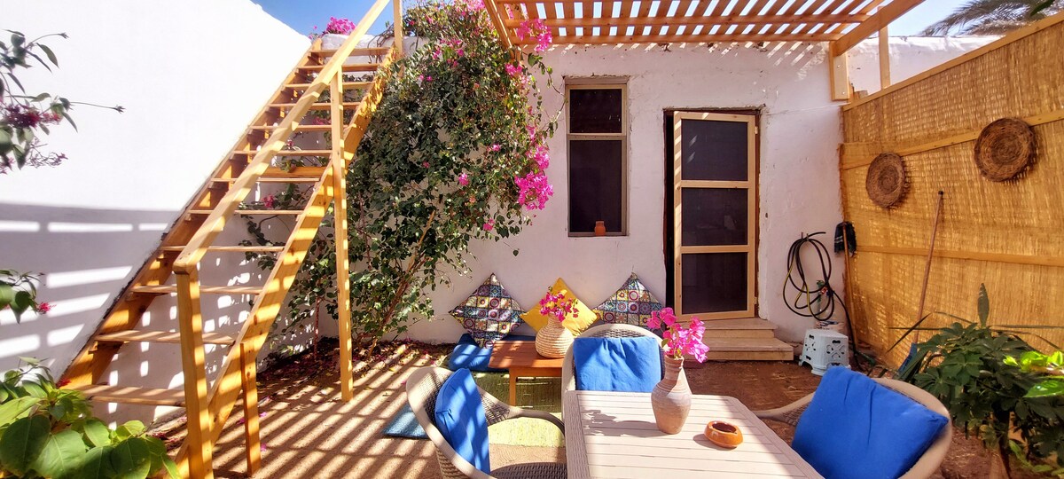 Maison confortable et ensoleillée de 2 chambres avec climatisation, jardin privé et toit-terrasse avec vue sur la mer ; à quelques minutes à pied de la plage de couleur turquoise ! Situé dans un village bédouin calme, vous vous sentirez vraiment immergé dans la beauté naturelle unique de Dahab. À 3 minutes à pied de la place Assala pour faire du shopping et dîner, y compris une boulangerie allemande. Marché fermier à une minute à pied. Les équipements modernes comme le Wi-Fi, le lave-linge et la cuisine complète permettent une expérience détendue et agréable !