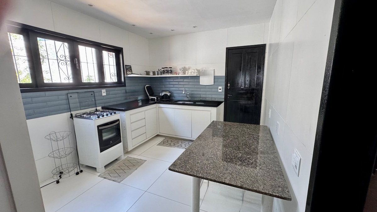 Welcome to your tranquil getaway! - Beautifully decorated house with great taste and comfort. - Spacious and functional house surrounded by greenery, providing tranquility. - Four spacious suites with comfortable beds and bathrooms. - Outdoor barbecue area perfect for social gatherings. - Exceptional attention from the host, Manuela. - Large garage with covered parking for one car. - Enjoy al fresco dining in the lush tropical garden.