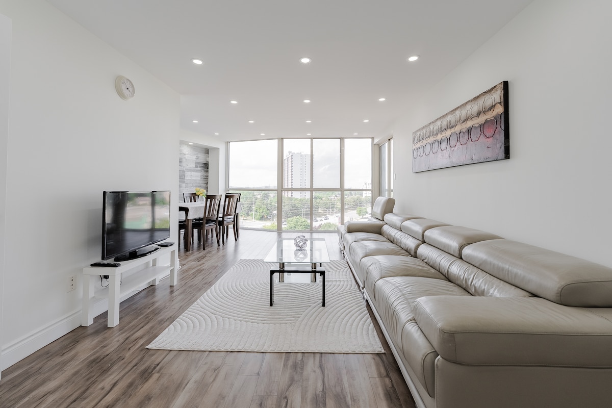 Découvrez la vie de luxe dans ce superbe penthouse avec 2 chambres, 2 salles de bain, 1 parking gratuit et de hauts plafonds au cœur du centre-ville de Mississauga. Situé juste en face de Celebration Square et Square One, profitez d'une vue imprenable sur la ville à travers les fenêtres qui montent du sol au plafond. Parfaite pour les séjours d'affaires ou de loisirs, cette suite entièrement meublée offre un confort moderne, une connexion Wi-Fi haut débit, une télévision connectée, un parking et un accès facile aux transports en commun.