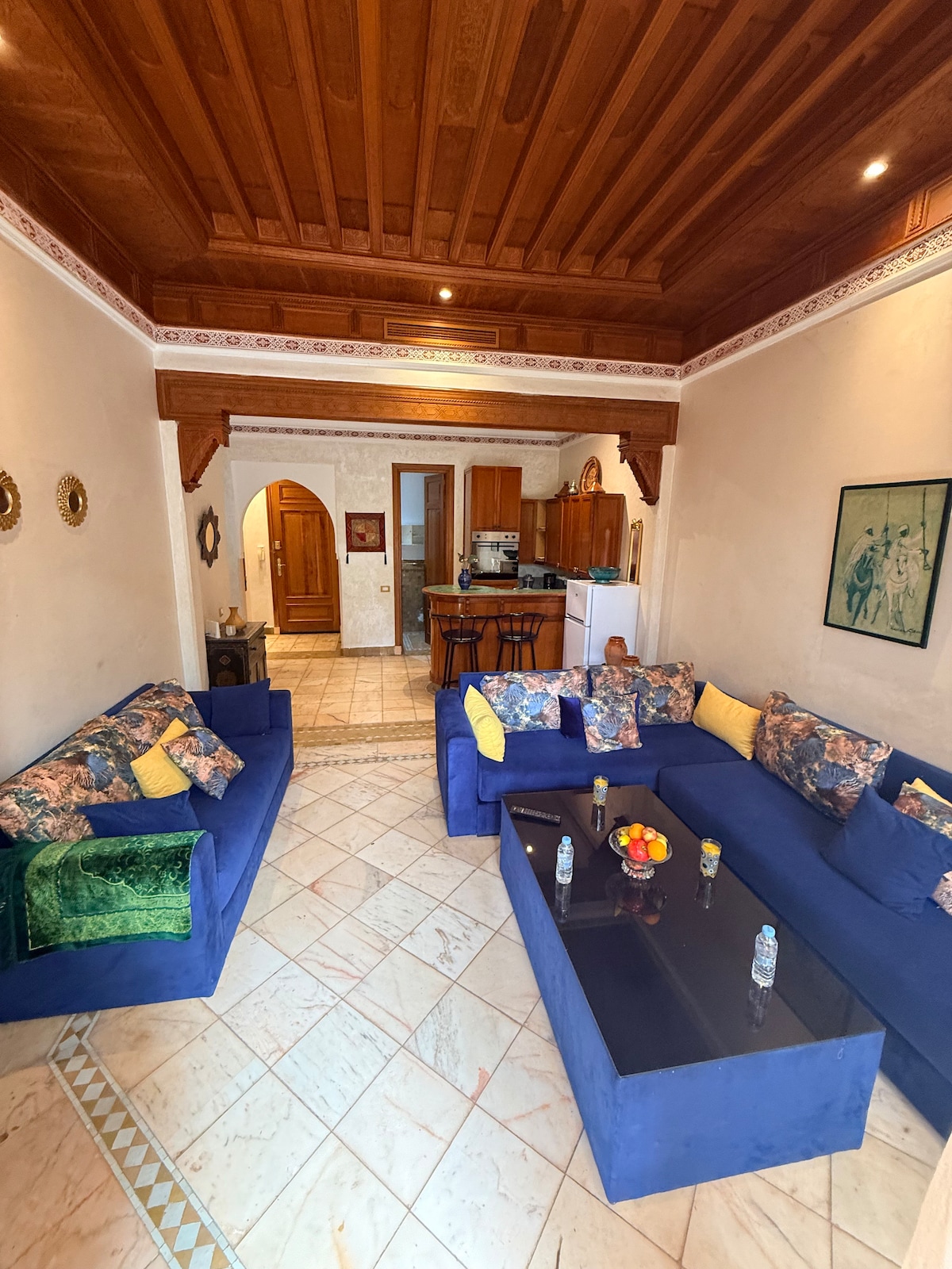 Riad situé dans une résidence paisible. Ce logement moderne et confortable avec une déco marocaine contemporaine, il dispose de 3 chambres parfaites pour accueillir jusqu'à 6 personnes (voir plus....) Les visiteurs apprécient le calme de la résidence tout en étant à qlqs min des principales attractions de la ville: la Médina ,les souks ,la place jemaa el fna ,les jardin YSL,bahia ,badi,sercret.... Profitez aussi des jardins privés de la résidence ou chiller au bord des 3 piscines.