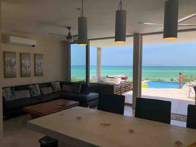 Excellente maison face à la mer à 6 km à l'est de Sisal, nouvelle, piscine, 3 chambres climatisées, entièrement équipée, wifi, télévision. Terrasses au premier et deuxième niveau avec une vue spectaculaire sur le golfe du Mexique. Une chambre a des superposés. Deux chambres ont chacune un lit king.