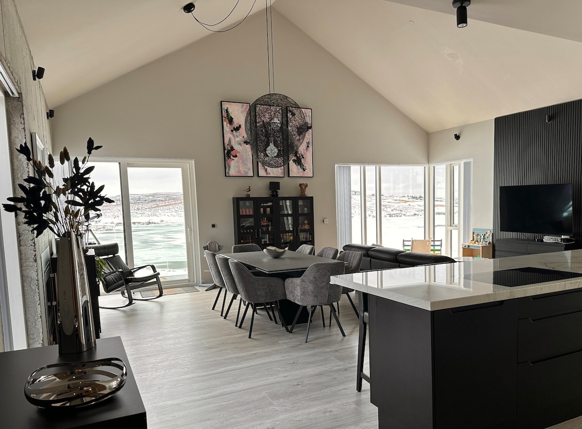 Lakefront Villa located in a new Eco-certified neighborhood built inside Heidmörk nature reserve and only 15 min drive to downtown. Mesmerising view, large windows perfect for night sky stargazing and seeing northern lights inside the capital area. Surrounded by beautiful nature, moss and lava with lots of walking paths and innovative playgrounds as well as more extreme hiking options. Polestar 2 electric car available for rent with baby seats included. Perfect for nature lovers and families.