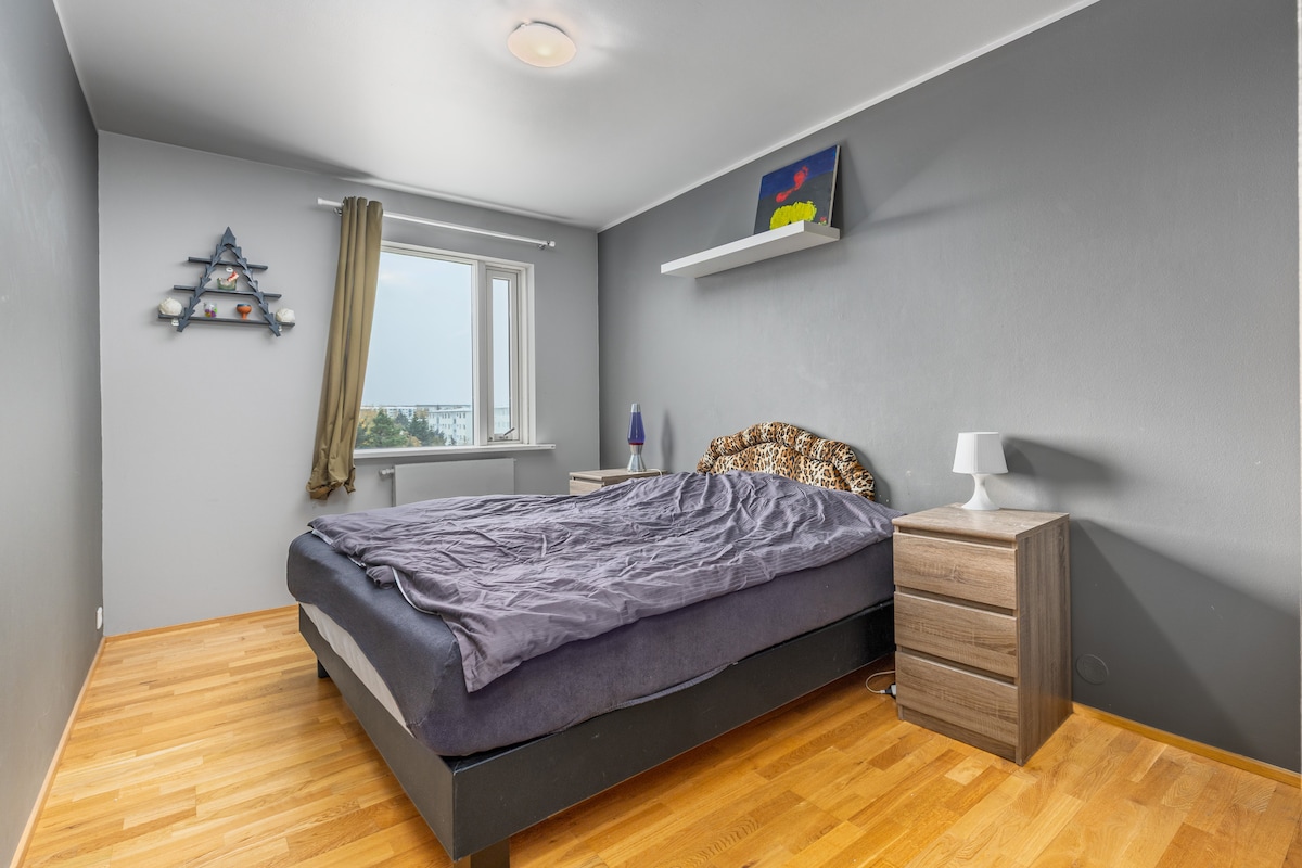 Vous louerez une chambre dans un appartement spacieux et lumineux de 3 chambres. Vous disposez d'un lit 200x200, avec des tables de chevet et des lampes de lecture. Il y a une autre chambre sur Airbnb. En bordure du centre de Reykjavik à Hlemmur, il est à quelques pas de tous les cafés, magasins, restaurants, bars et sites touristiques du centre-ville. Épicerie Bónus à 5 min à pied, Extra et 10-11 sont les magasins de proximité les plus proches, chacun à un pâté de maisons. La piscine de Sundhöllin (y compris les jacuzzis et le sauna) est à 5 minutes à pied. Arrêt de bus n° 9 pour les visites/aéroport à 100 m