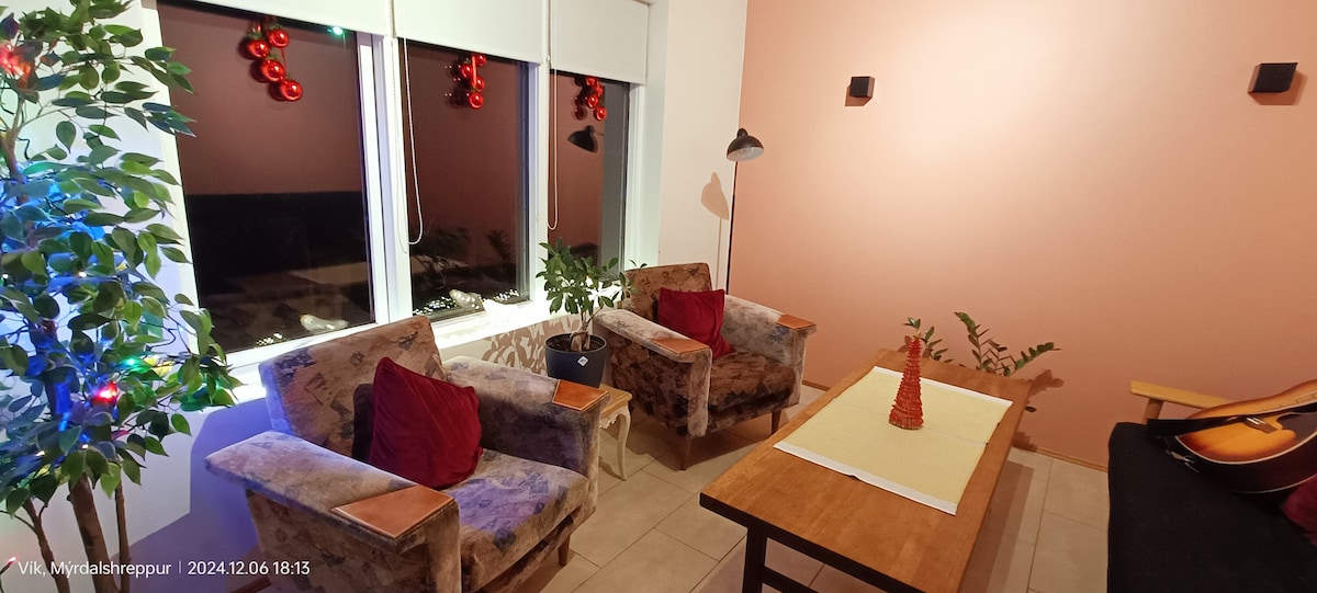 Chalet situé dans la ferme la plus au sud de l'Islande avec une vue magnifique sur Reynisfjara, Dyrhólaey et les glaciers. À seulement cinq minutes à pied de la plage où vous trouverez des colonnes de basalte et des grottes. Le village de Vík est à 10 minutes en voiture du chalet.