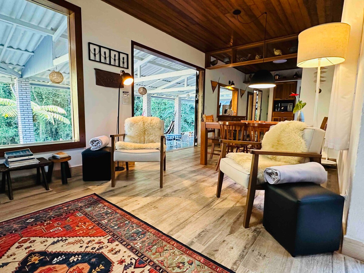 Si vous recherchez la paix, l'intimité, le bien-être et vous reconnecter avec la nature, c'est l'endroit qu'il vous faut ! Et que diriez-vous d'une escapade romantique, de repos et de moments en famille ou de votre bureau à domicile dans la forêt atlantique? Et votre animal de compagnie n'a pas besoin de rester dans un petit hôtel, il restera avec vous et se baignera dans la nature. La Casa do Lago a tout ce dont vous avez besoin : à 59 km ou 1 heure de São Paulo, Internet super rapide de 460 Mbps, des installations modernes et confortables, une cuisine et une literie complète. Venez voir!