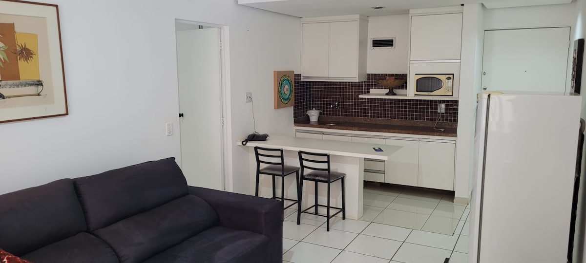 Appartement climatisé, ménage quotidien, service d'étage, TV, WiFi, lit queen size, réception ouverte 24h/24, piscine, salle de fitness, parking gratuit avec voiturier. Balcon et chambre séparée du salon. Linge de lit, couverture et serviettes disponibles. Les animaux ne sont pas acceptés. À proximité du Carrefour, du centre commercial Santa Úrsula, des restaurants, de la gare routière, du centre de congrès, du front de mer, des boutiques et de la Choperia Pinguim ! ARRIVÉE APRÈS 14 H ET DÉPART AVANT 12 H