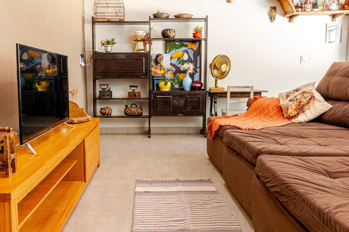Maison dans un condo à 5 pâtés de maisons du centre de Bonito. En plus des chambres climatisées, elle dispose d'une salle de bains et d'une salle de séjour avec canapé-lit, table, TV et ventilateurs de plafond. La cuisine est équipée d'une cuisinière, d'un réfrigérateur, d'un micro-ondes, d'un four électrique, d'une cafetière et d'autres ustensiles. Il dispose d'une connexion Wi-Fi, d'un hamac à côté de l'entrée de la maison, ainsi que d'une place de parking. Il dispose également d'une buanderie avec une cuve et une machine à laver, à côté de la cour privée avec barbecue portatif et bancs en plein air.
