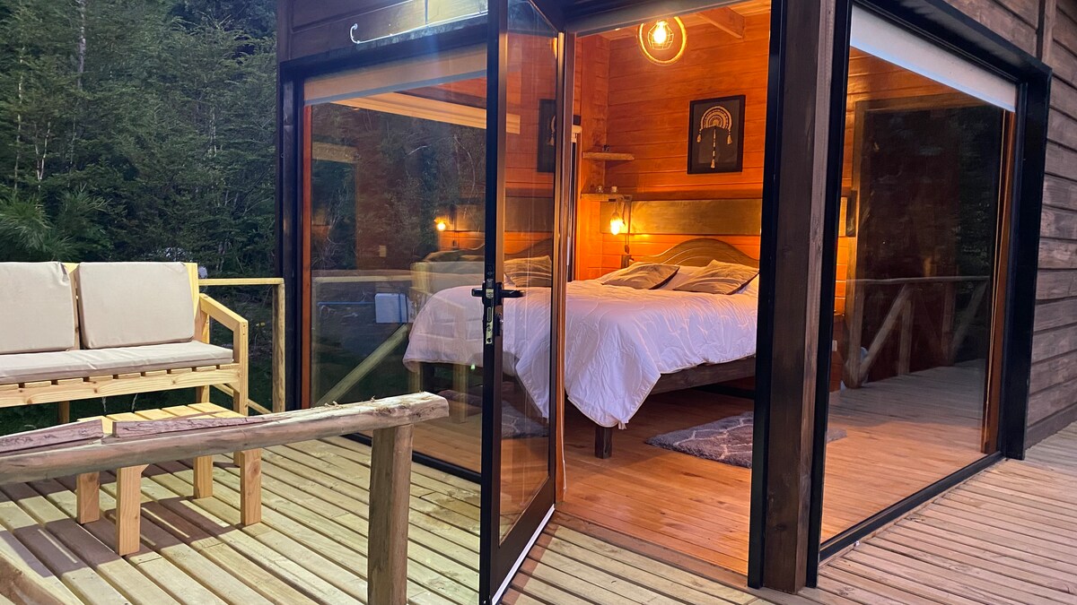 Duplex for 2. 7 mts above ground. 2 acre private park. Decks with panoramic views to infinity and a hanging bridge to let your dreams fly. Thermal insulation, double glass windows, floor heating and slow combustion fireplace. Queen size bed. Desk, Wi-Fi, full kitchen with fridge, induction top and all the necessary utensils to enjoy the stay. Full bath with a shower with amazing view, towels, hair dryer, bidet!, fire pit, bbq and parking. 6 kms from Pucón on paved road. Ran by its owners.